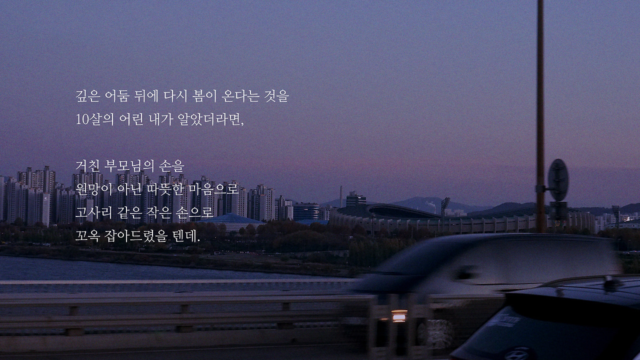 나의 부모님 역시 이른 아침부터 늦은 밤까지 일을 하셨다. 두 명의 자녀가 아직 어리니 어떻게든 먹고사는 문제, 생계를 이어나가려면 두 어른은 자신들 중년의 삶을 처절한 생계의 현장으로 내몰아야만 했다.