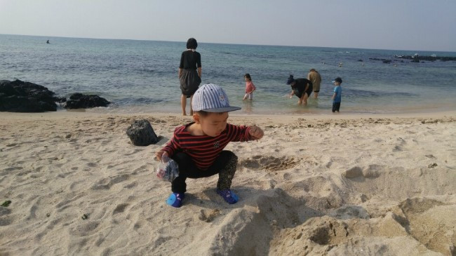그리고 내게 허락된 또 다른 천국. 아이는 고운 모래와 잔잔한 파도를 장난감 삼아, 어디서 주워온 쓰레기 같은 것들을 모아 열심히 놀았다. 나는 우산을 쓰고 모래사장 위에 앉아 그저 아이가 노는 걸 바라만 보면 되었다. 세상에, 이런 육아 천국이 다 있다니!
