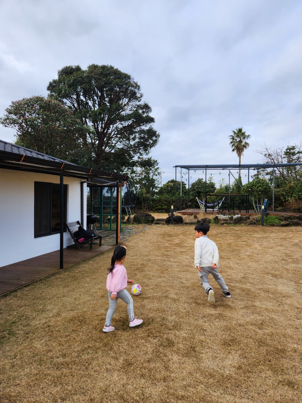 제주 날씨는 물론 매섭게 춥기도 하지만 햇빛이 좋은 어떤 날은 봄처럼 따뜻하기에 겨울에도 앞마당이 있는 숙소를 포기할 수 없다. 아이들은 추위에도 아랑곳하지 않고 넓은 잔디밭에서 공놀이도 하고 둘이서 뛰어다니며 신나게 놀았다. 나는 따뜻한 온돌방에서 창문 너머로 앞마당에서 아이들이 잘 노는지 바라보며 책도 읽고 여유롭게 쉴 수 있었다. 아이들이 뛰어놀기에 충분히 넓은 마당과 어린이용 방방, 여름에는 물놀이를 위한 미니 풀장도 설치된다고 하니 제주도 관광이 아닌 휴식을 위해 찾는 가족들에게 아주 강추하는 숙소이다. 비슷한 콘셉트의 다른 펜션보다 가격도 저렴한 편이다.
