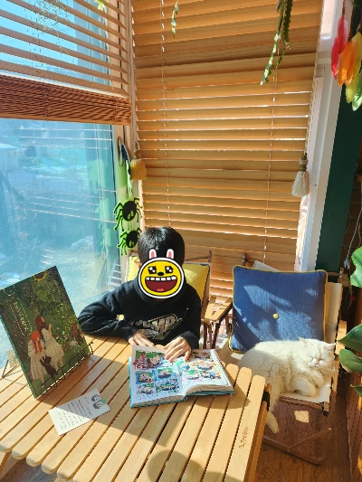 바로 퐁퐁과 그의 딸 밍키입니다. 아들은 마치 이 두 녀석이 책 친구라도 되는 것처럼 꼭 옆에 붙어 앉아 책을 읽습니다. 책방의 주인들답게 떠들지도 않으시고 갸르릉 대지도 않고 조용히 이곳저곳을 돌아다니다가 철퍼덕 잠이 드셨네요. 얘네들 쳐다만 보고 있어도 시간이 너무 잘 흘러가버립니다.