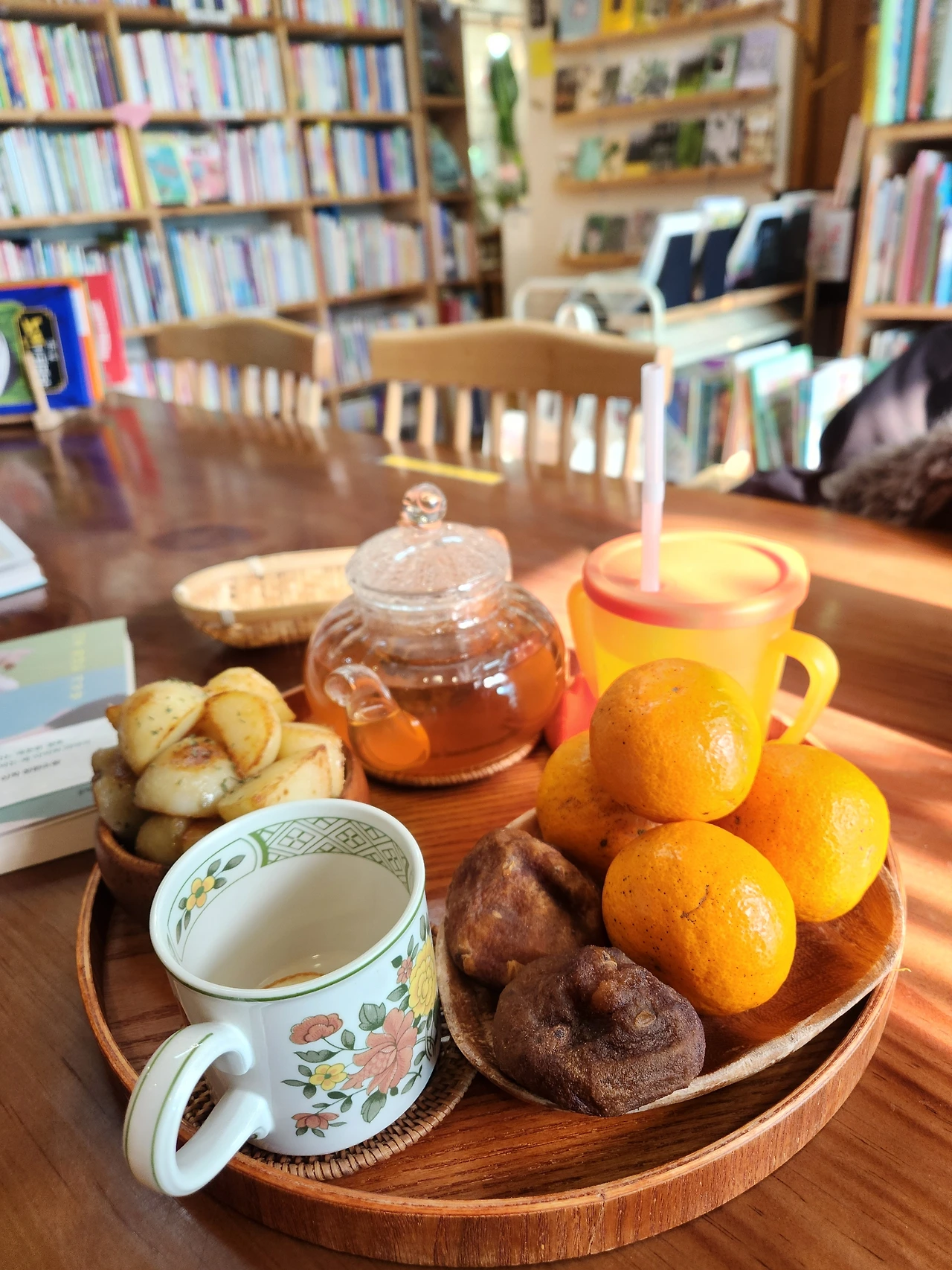 오늘 읽어 볼 책들을 몇 권 골라 테이블에 앉으면 사장님께서 따뜻한 차와 간식들을 내어오십니다. 오늘은 감자구이, 귤, 사장님 남편이신 농부사장님께서 직접 만드셨다는 곶감이네요. 그리고 겨울에 어울리는 귤차까지. 이렇게 맛있는 간식을 앞에 두고 한 입씩 베어 물며 아들과 나는 책의 세계로 깊이 들어갔습니다.