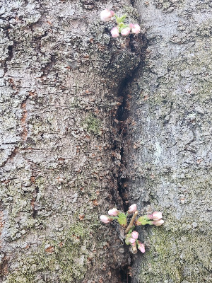 내려가는 길에 벚나무 등에 특이하게 바짝 붙어 맺혀있는 꽃송이가 눈에 띄었다. 보통은 나뭇가지에 꽃들이 맺혀 피는데 등짝에 바짝 붙어 맺힌 모습이 기형적으로 보여 남편에게 보여주었더니 뜻밖에 서정주 시인의 '상리과원'이라는 시에 이런 모습을 재밌게 표현한 부분이 있다며 한 문장을 읊어 준다.