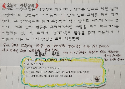편지 속의 오늘의 과학상식'활공'이니 '고익'과 같은 어려운 한자단어가 들어 있네요. 대부분 어려운 단어가 있으면 괄호 안에 풀어서 설명해 주었는데, 이 편지엔 아무런 설명이 없는 걸 보면 이 날은 옆집엄마가 무척 바쁜 날이었나 봐요. 아이가 어떻게 이해했을지 무척 궁금해지는데요. 이 참에 앞뒤 맥락을 바탕으로 내용파악하는 능력이 생겼으려나요?