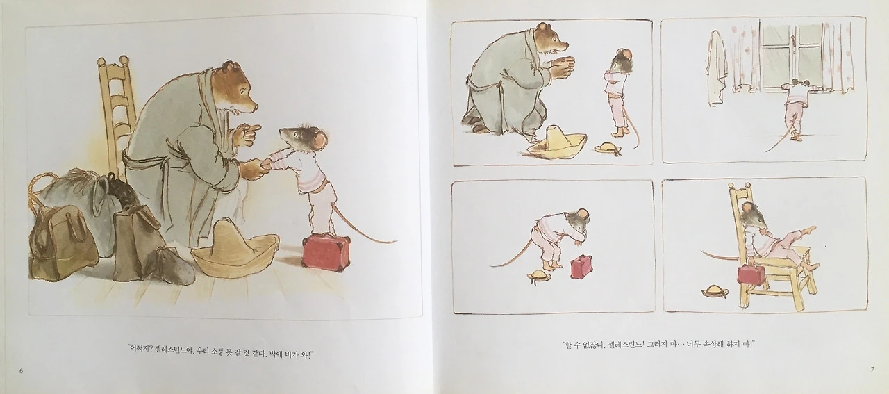 꿈에도 생각하지 못한 아저씨의 말에 셀레스틴느는 영 아쉬워하며 가방을 내려놓지 못한 채 속상해한다. 그림책 속의 이 장면을 보고 있자면 셀레스틴느의 반응과 몸짓들이 어찌나 생생한지, 그림책을 보고 있는 나도 안타까워 어쩔 줄 모르게 된다. '그림책에 그린 이야기들은 직접 체험했거나 관찰한 것들'이라는 작가의 말이 금방 마음에 와닿는다.