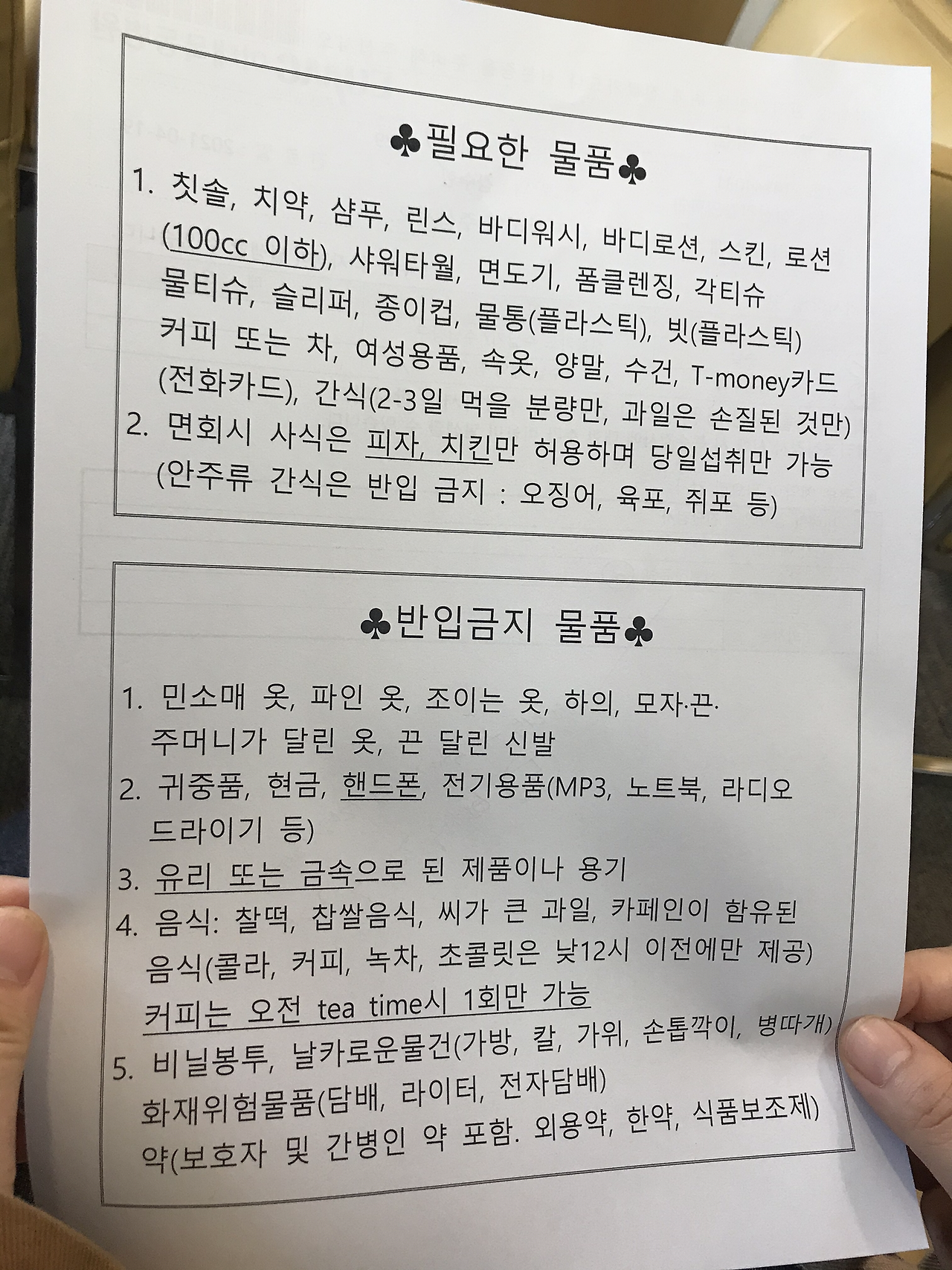 폐쇄병동 입원 안내문. 입원 전날 운동화만 가득한 신발장에서 끈 없는 신발을 찾느라 혼났다.