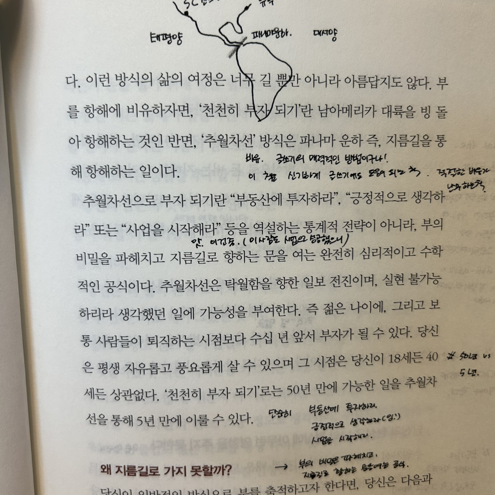 한 구절에서 기가 막힌 깨달음이 얻었을 때 그걸 옆에다 바로 적고, 궁금한 점도 적고 있노라면 그 책의 저자와 마치 일대일로 이야기를 하는 느낌을 받는다. 논리적으로 저자의 의견이 이해가 안 될 땐 “그렇지만 이건 그때 경제 상황이 좋아서 성공한 게 아닌가요?' 혹은 감탄하며 ‘당신이 말하는 그런 사람이 바로 전데요’라고 적어둔다. 가끔은 단락의 키워드를 옆에다 해쉬태그처럼 쓰기도 하면서 말이다.