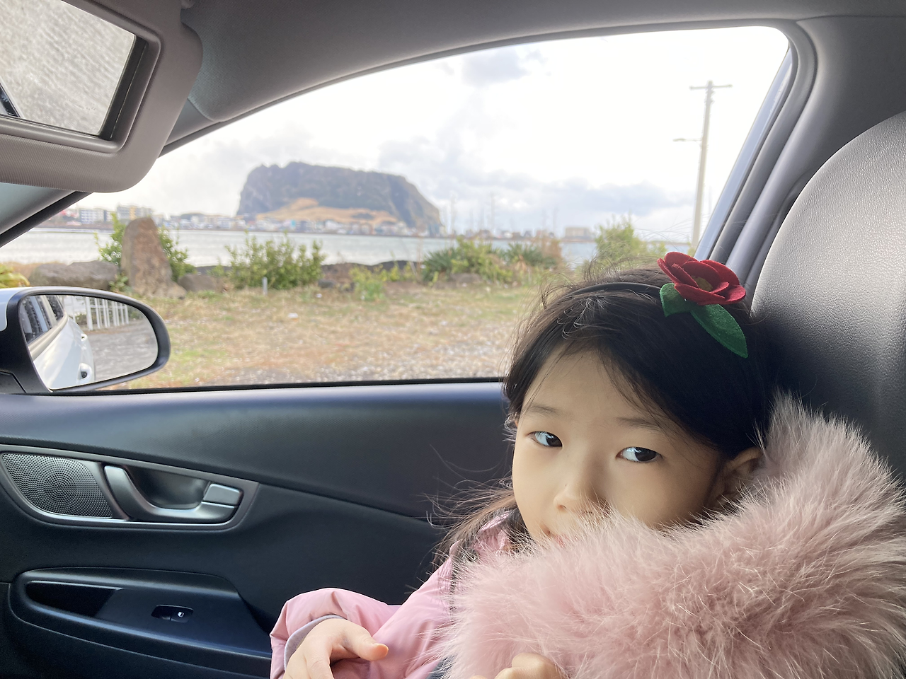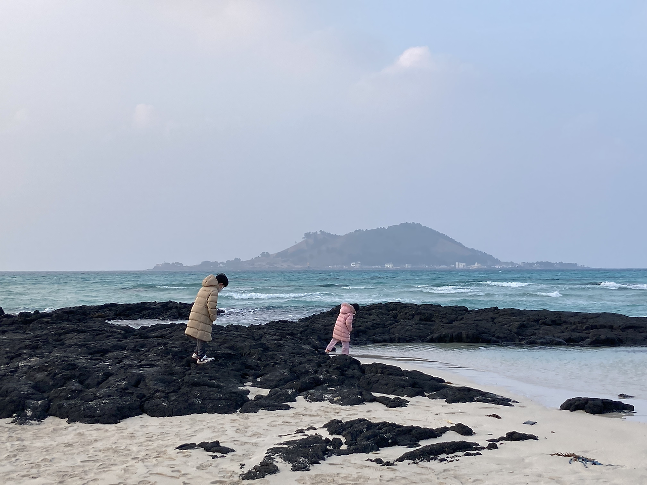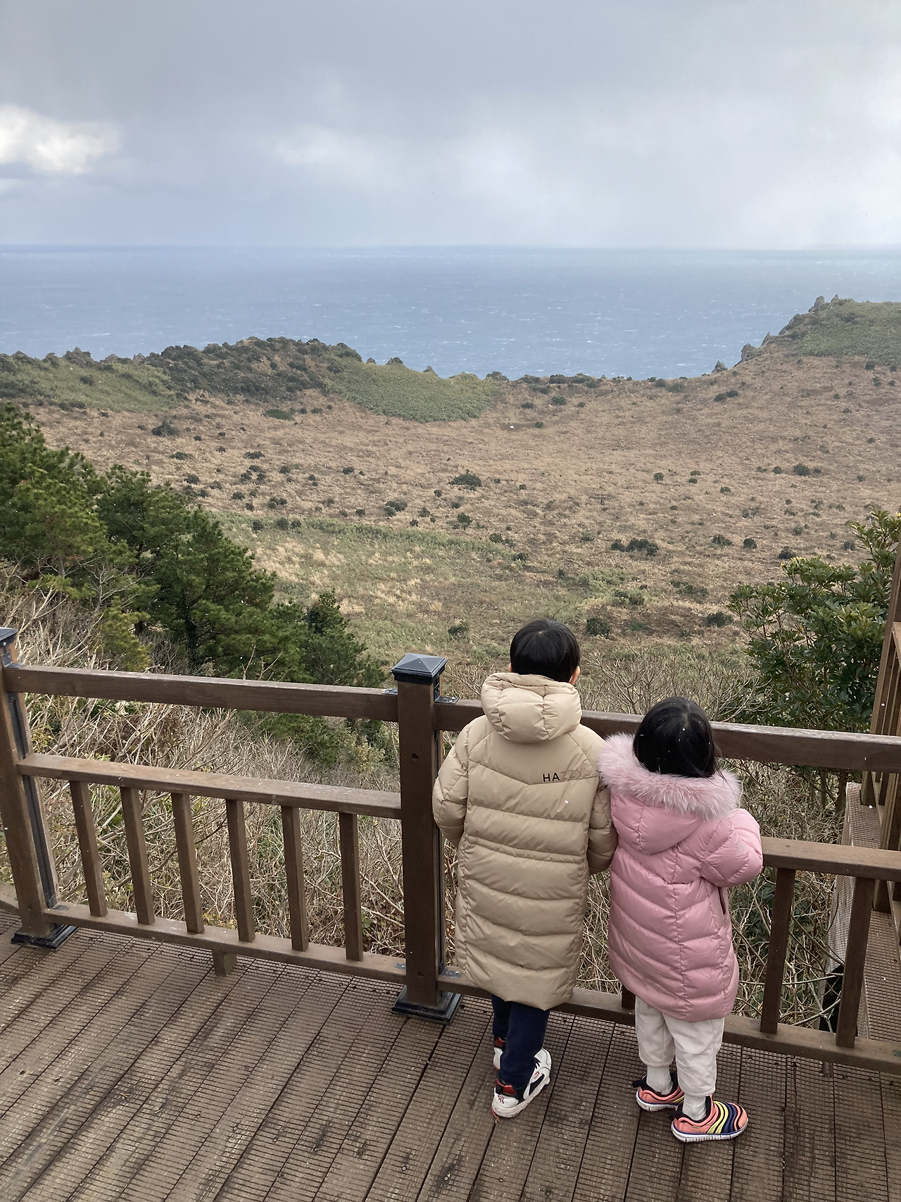 저 멀리 웅장한 성산 일출봉이 보인다. 용암이 흘러 흘러 동쪽 바다 끝에서 솟아 나와 만들어졌다는 성산 일출봉. 그의 생성 과정을 생각해 보면 남다르게 느껴진다. 해안가로 내려오니 눈바람은 잦아들고 찬란한 햇빛 가득하니 다른 곳에 온 것 만 같다. 눈발이 조금은 날리지만 일출봉 등반을 해보기로 결심했다. 이 녀석들이 과연 잘 올라갈 수 있을까? 우려했던 나의 생각은 완전한 기우였다. 나를 버려두고 아이들은 눈앞에서 사라져 버렸다. 헥헥 계단을 따라 올라가는 게 힘들기만 한데 아이들은 마치 솜털처럼 날아서 정상으로 먼저 가버린 거다. 약간의 고소공포증에 바람까지 들쑥날쑥 불어와서 난간을 붙들고 벌벌 떨며 올라가기 시작했다