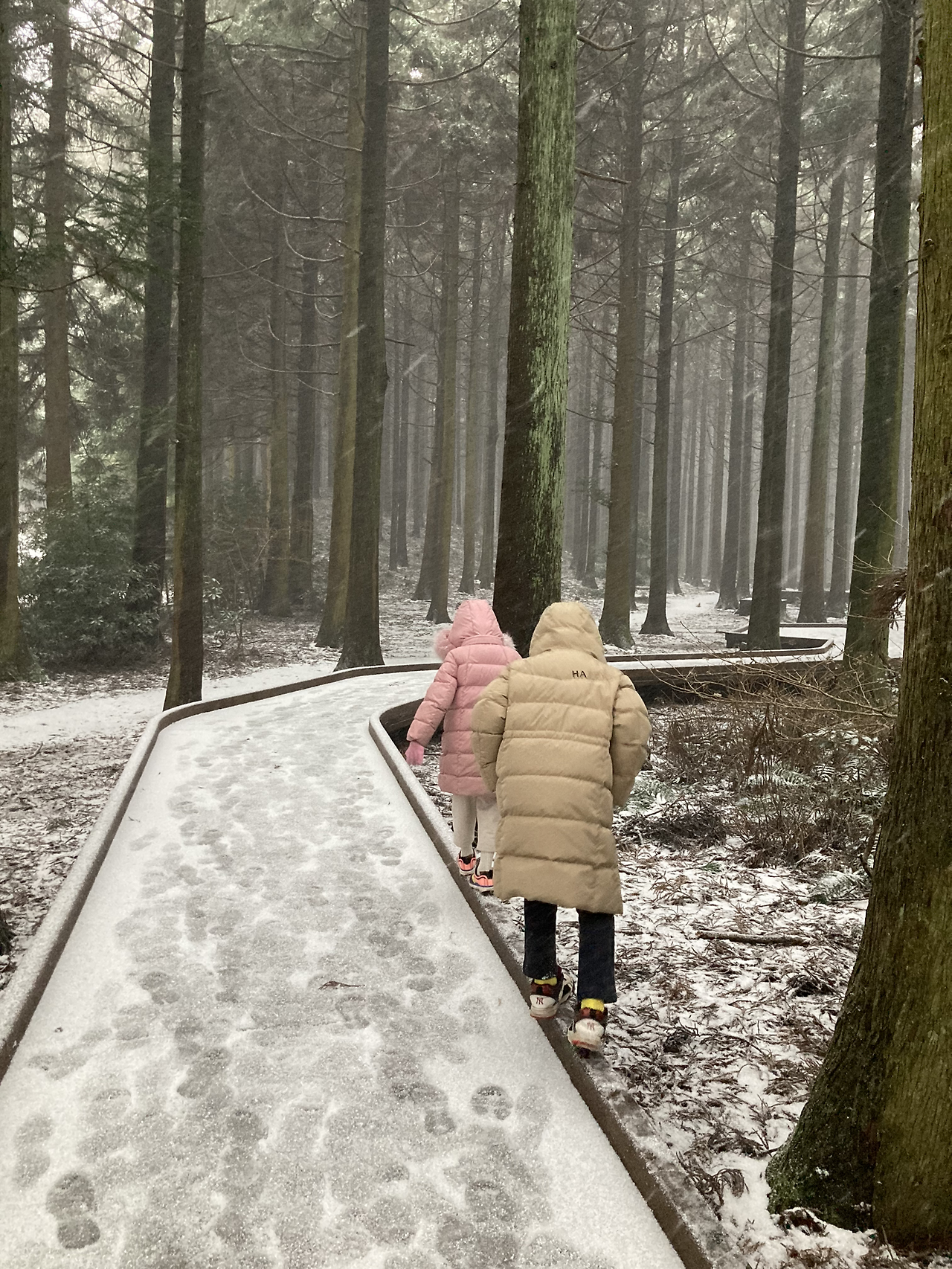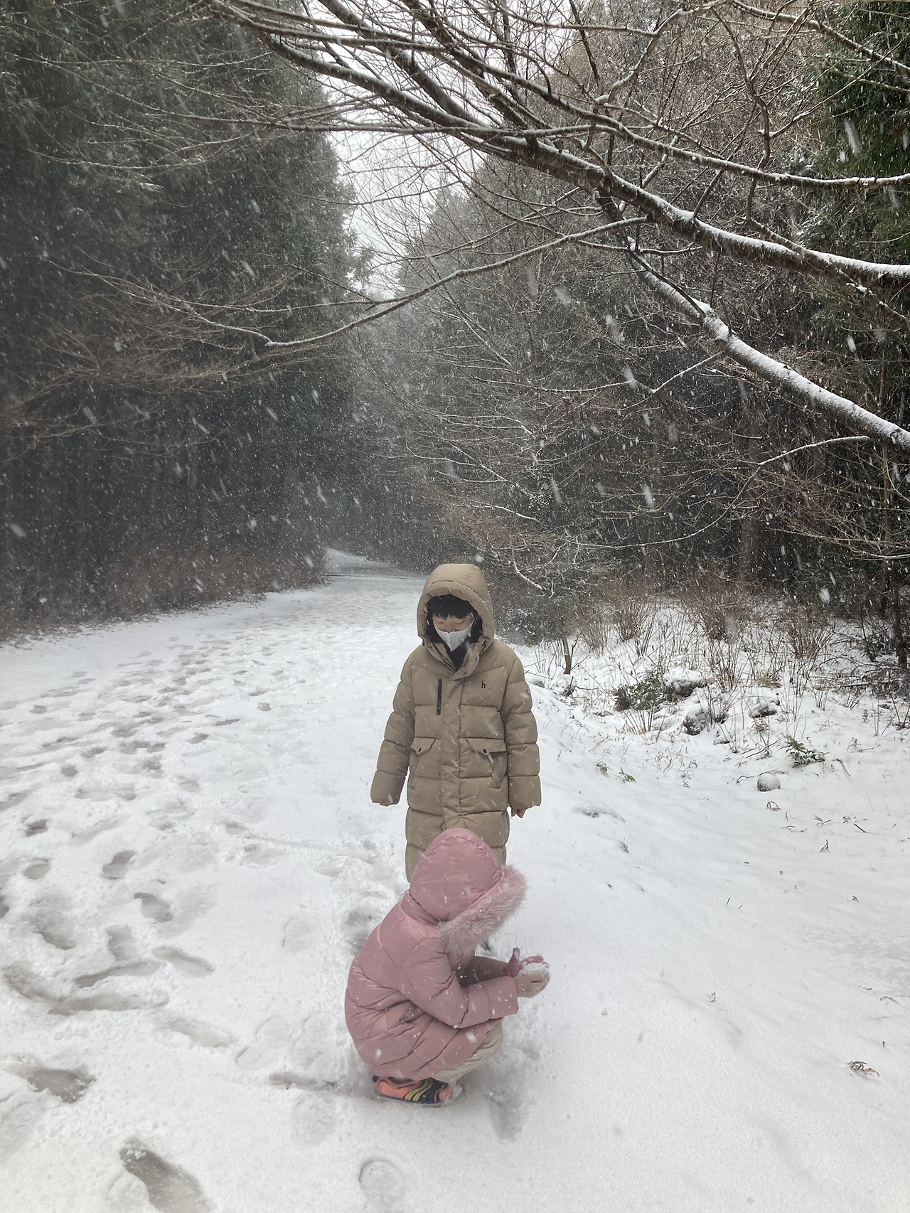 사려니숲으로 들어서자 눈보라가 가로로 친다. ‘우 웅’ 소리가 귓가에 맴돌고 숲의 신비한 기운을 느끼며 서있다. 어제만 해도 사람들로 북적였던 이곳이 우리들 만의 숲이 되어 주었다. 아이들은 눈 속에서 마냥 신이 났다. 하얀 눈잔디에 털썩 드러누워서는 손과 발을 왔다 갔다 하며 천사모양 만들기를 성공했다. 꼬마눈사람과 인증샸도 찍었다. 오래 머물고 싶었지만 꽁꽁 얼어오는 손발 때문에 30분 만에 철수했다. 눈보라가 치는 사려니 숲의 그 길은 몹시도 신비로웠다.