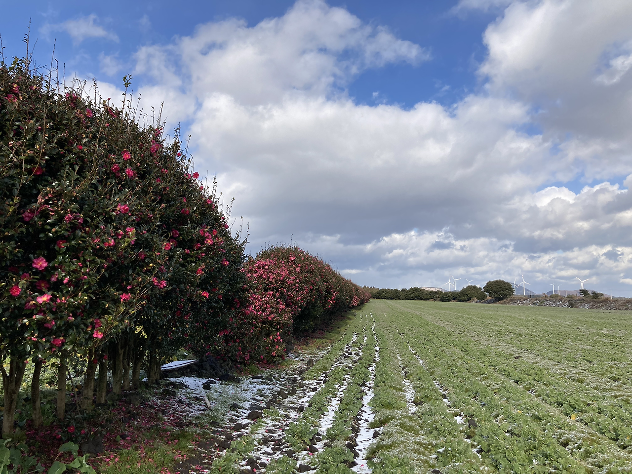 어디로 갈까? 따로 정해진 일정은 없었다. 정처 없이 마음이 이끄는 데로 차를 몰아가 본다. 동쪽 성산일출봉 쪽으로 방향을 틀었다. 가는 길에 야생의 동백꽃길을 발견했다. 눈부시도록 파란 하늘아래 빨간 동백꽃이 어찌나 아름다왔던지. 차에서 내렸더니 이런 실수로 살얼음 웅덩이 위에다 주차를 한 거다. 철퍽하고 그만 신발이 젖고 말았다. 볼까지 빨갛게 얼었지만 아이들과 동백꽃길을 걸었다. 입장료도 없는 아름다운 공원이라니. 아름다운 풍경을 눈 가득히 담고 출발했다.
