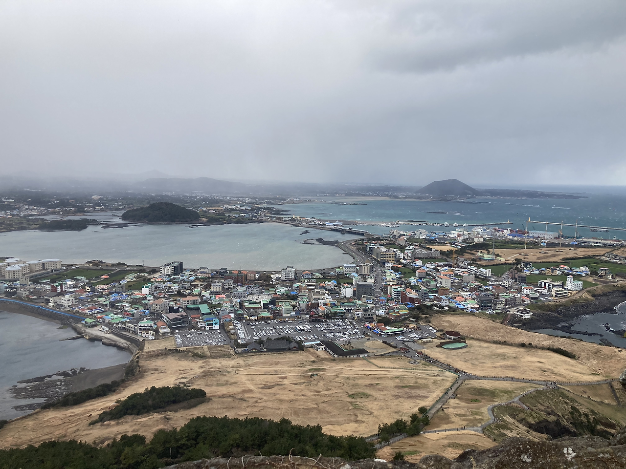 휘잉 사람을 살짝 휘청이게 하는 바람과 함께 정상에 도착했다. 탁 트인 바다와 분화구. 뒤편으로는 우도 그리고 성산의 마을, 오름들까지 제주 동쪽이 한눈에 들어온다. 아이들은 20분 만에 이 높디높은 일출봉에 오른 것이 너무나 뿌듯했나 보다. 다음에 또 오리라 다짐하면서 성산과 작별을 고했다.