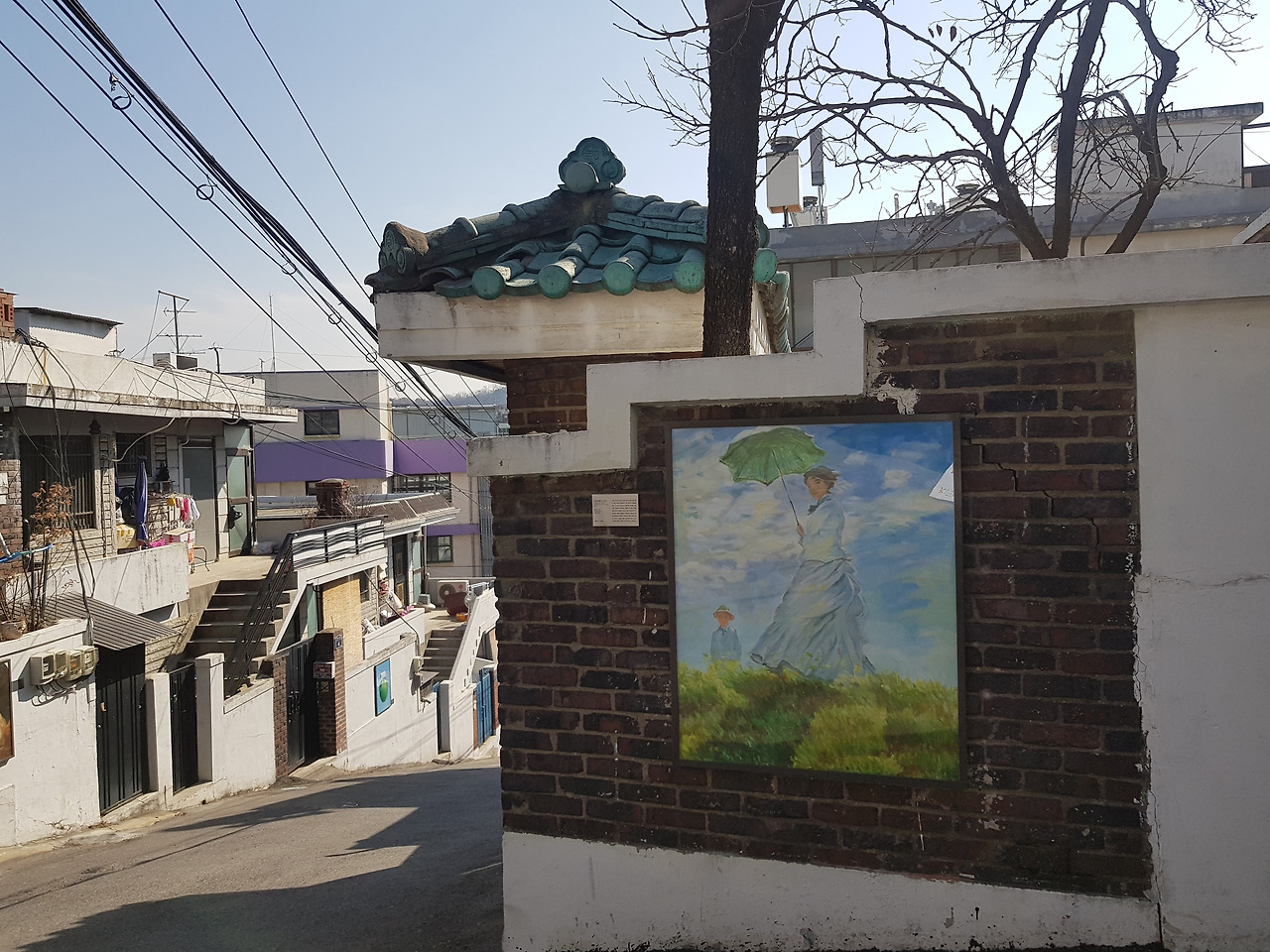 벽화가 아니라 지역 작가들이 직접 그린 명화를 담벼락에 걸어뒀다는 점이 신선했다.