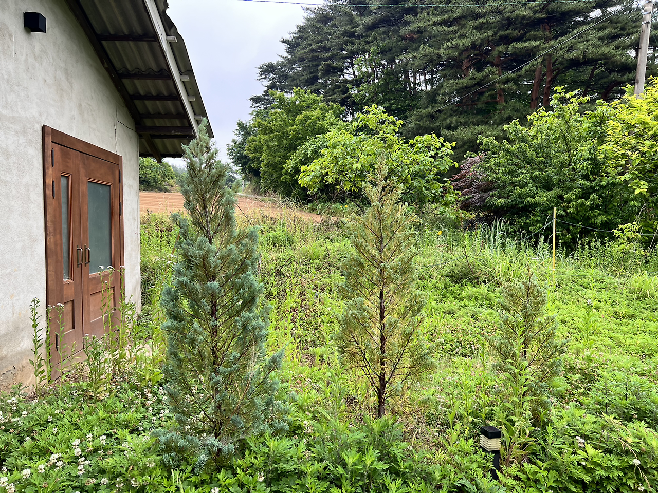 힘이 없어 보이던 측백나무 트리오는 주변 색에 동화되어 푸른빛을 찾았다. 이 정글에서, 저 잡초들 사이에서 말이다. 올 겨울 만날 키가 큰 세 그루의 트리를 위해, 언젠가 휘어잡고 싶었던 아무개의 머리칼인 양 풀을 집어 뜯었다.
