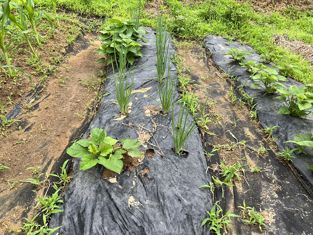 파와 고구마의 근황. 이 밭에는 질서란 없다. 빈자리에 쑥쑥 심은 고구마와 파는 주인의 관심을 필요치 아니하고 점점 키를 키워나갔다. 아참, 심을 땐 모두 죽은 줄 알았던 고구마 순들은 부케모양으로 새로운 순을 뿜어냈다.