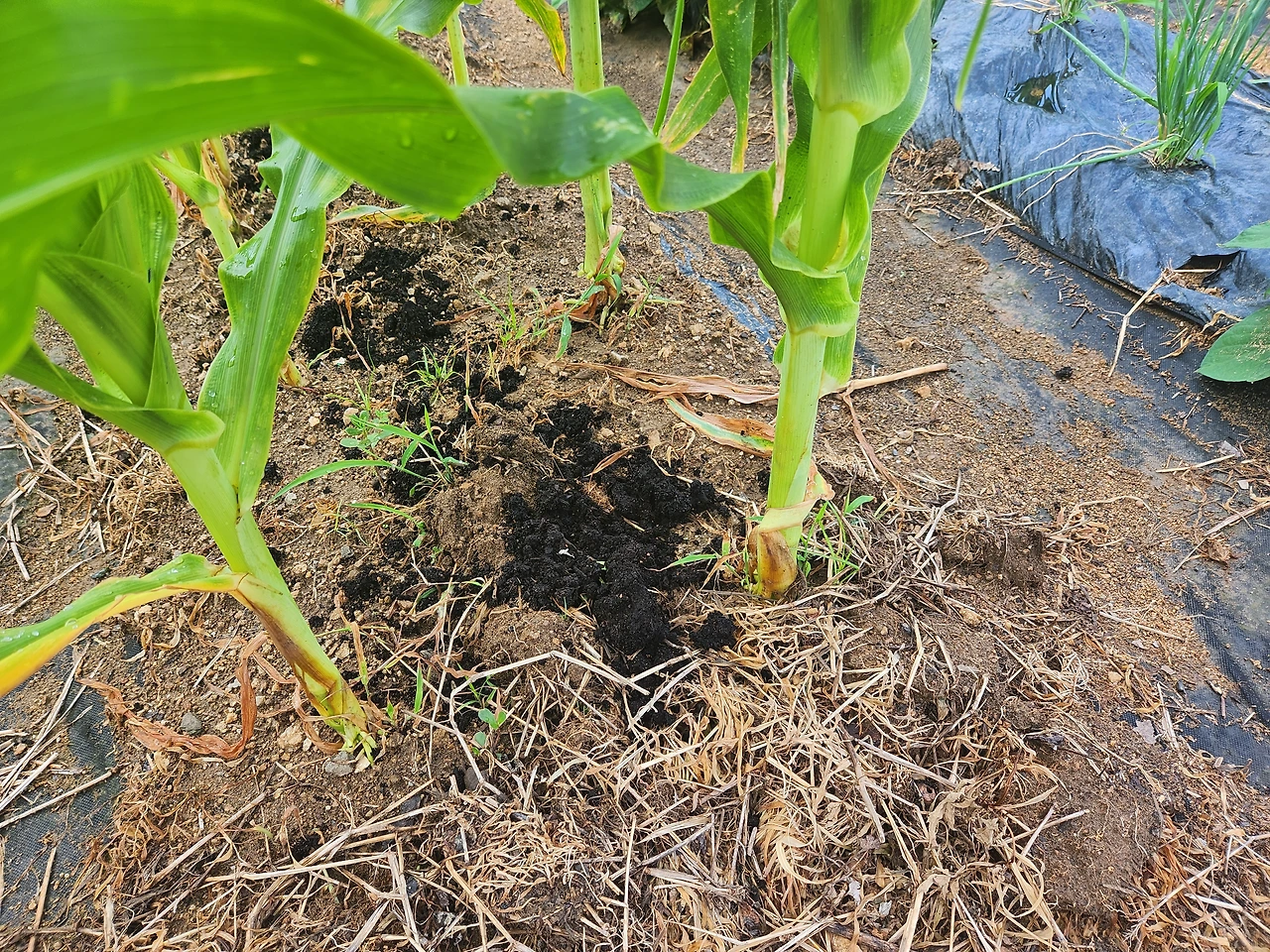 할머니 밭과 우리의 작은 텃밭에는 경계가 없다. 어느 날 옥수수 고랑에 정체 모를 까만 흙이 뿌려져 있는 것을 발견했는데, 같은 색의 흙이 뒷밭에도 있었다. 비료다. 기특한 우리 집 옥수수는 아무 땅에나 잘 자라는 게 아니었고, 할머니가 잘 키워주셔서 그리 무럭무럭 자란 것이었다.
