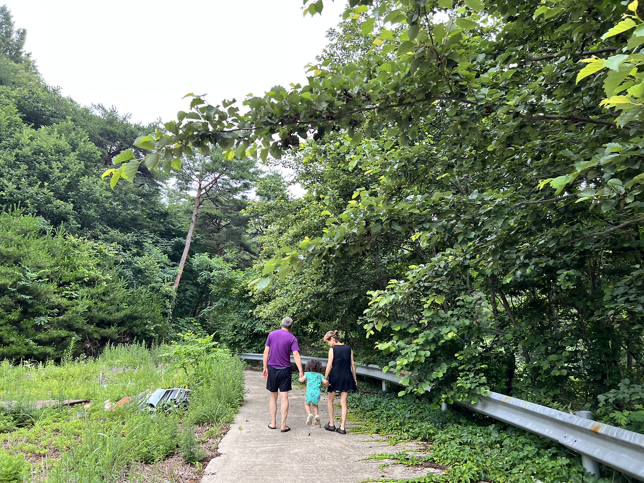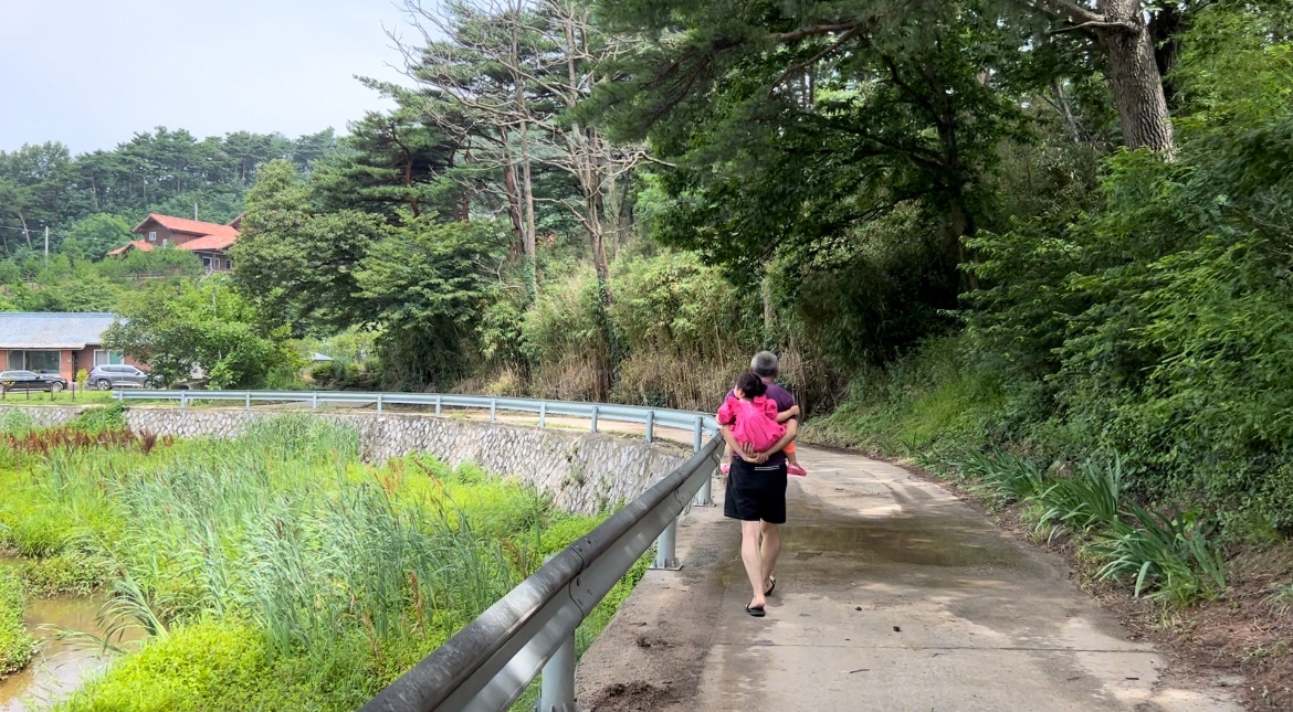지우는 가자는 대로 길을 나서는 할머니와 할아버지가 그리 좋았나 보다. 나도 가끔 사라져 평온을 맞는 순간이 좋았지만. 창밖에 고개를 내밀어 한바탕 산책 후에 또 사라진 지우와 나의 아빠를 찾았다. 이번엔 논밭길이었다. 멀리서 보이는 아빠와 지우의 모습이 애틋해서, 기록을 남겨드리고자 쫓아갔다.