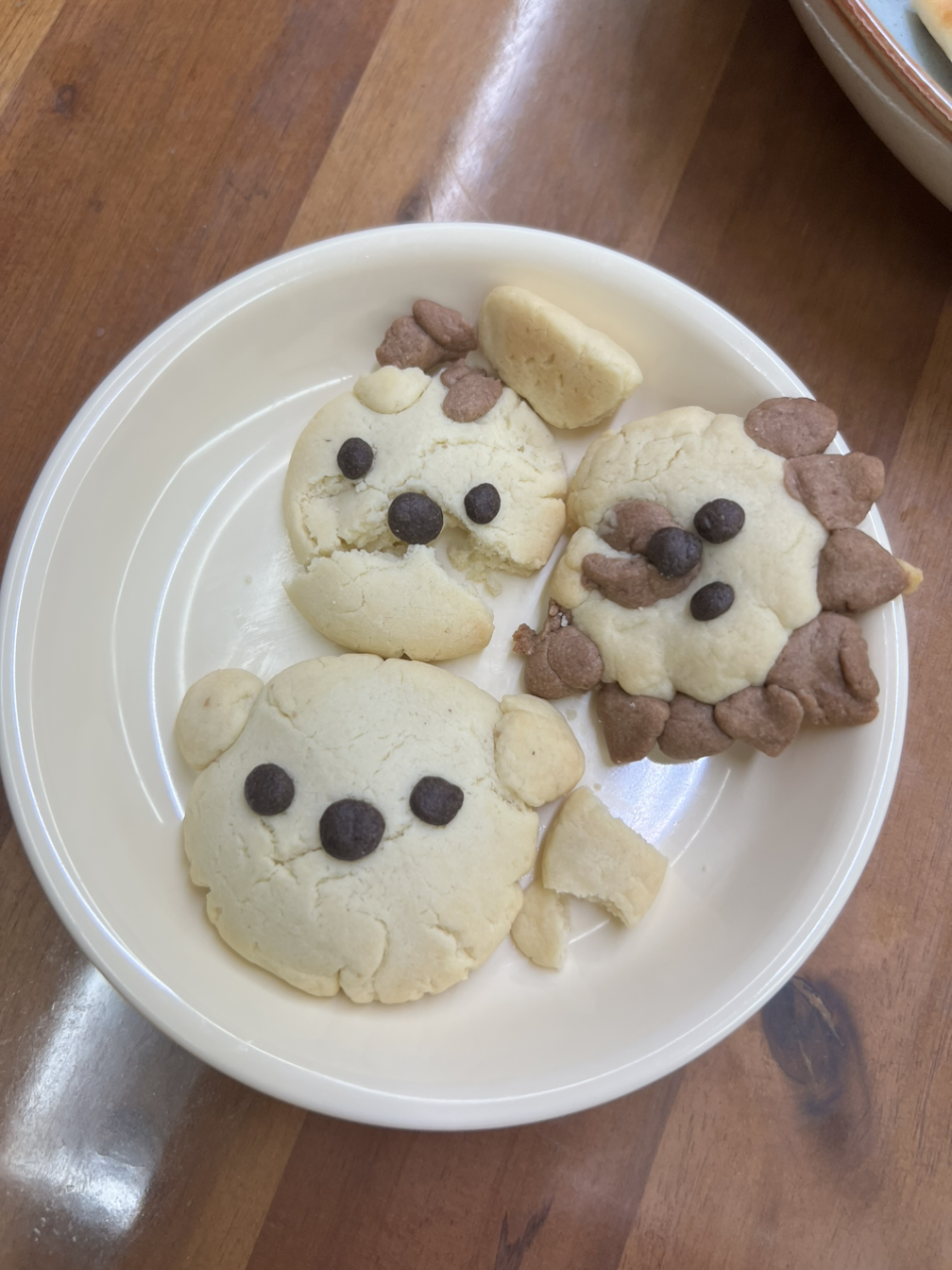 집으로 돌아와 지우를 씻기고, 든든한 피자 한판을 올려놓고 쿠키 만들기를 시작했다. 동글동글 지우가 얼굴을 만들면 어찌저찌 동물처럼 보이게 만드는 게 나의 임무다. 지우는 쿠키가 오븐에 들어간 십여분의 시간을 힘들어했다. 뛰어가서 가만히 지켜보다가, 돌아와서 도대체 언제 완성되냐며 투정을 부리다가 했다. 귀여운 내 아기.