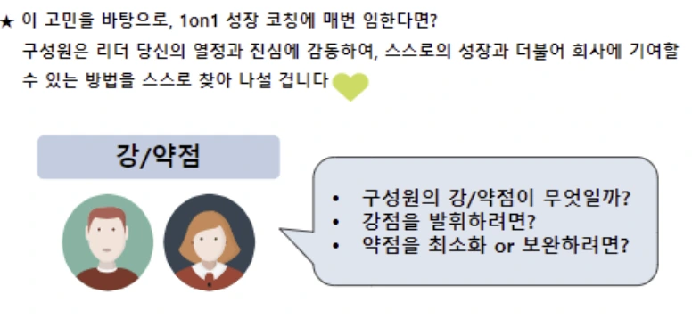 리더들의 입장에서는 1on1을 통해 구성원의 문제를 모두 책임지고 해결해줘야 한다는 부담을 느낄 수 있겠죠. 그래서 저는 리더들의 부담감을 최소화하기 위해 노력합니다. 우선 1on1에서 가장 중요한 것은 ‘팀원의 고민에 진심으로 공감하고, 꾸준히 관심을 가지는 것’임을 지속적으로 강조하고 있죠. 그뿐만 아니라 리더들이 원활히 대화를 이끌 수 있도록 ‘1on1 성장 코칭 가이드북’을 제작했습니다. 현재 1on1 관련 교육 프로그램도 준비 중이랍니다. 준비가 되면, 브런치를 통해 공유드리도록 할게요.