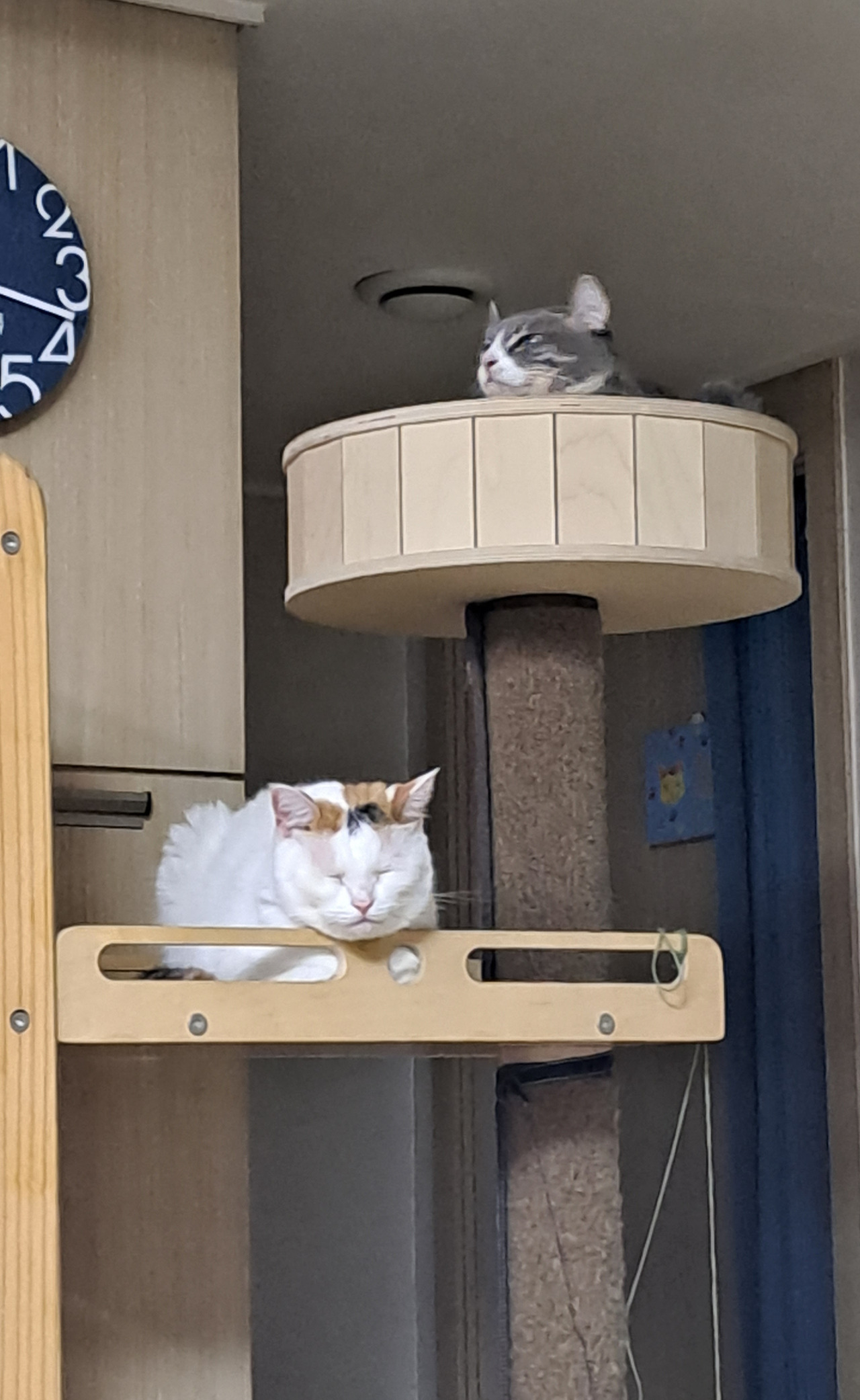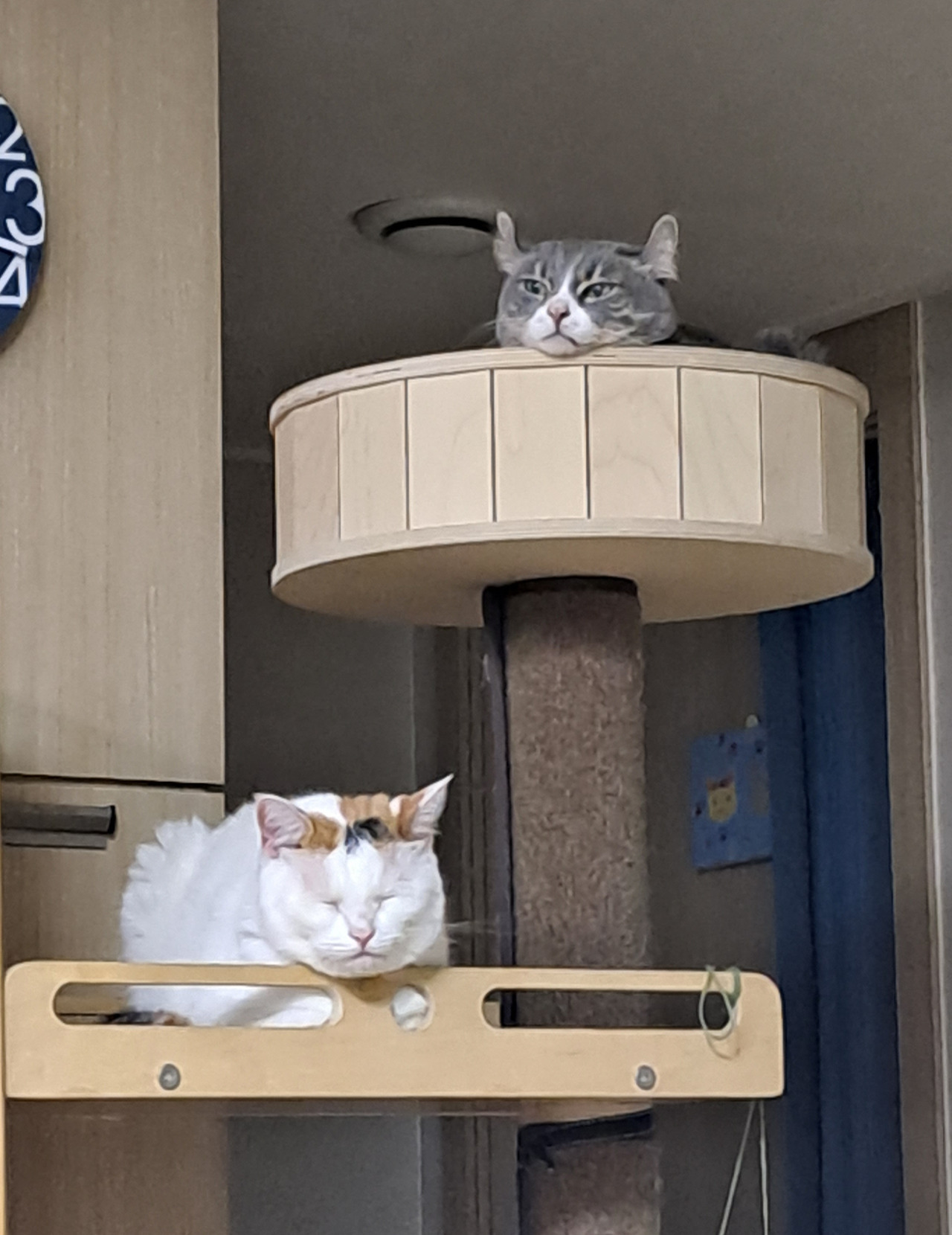 앞뜰도 없고 뒷동산도 없지만 눈비를 막아주는 튼튼한 집과 큰 캣타워가 있으니 싸우지 말고 원하는 자리 한 자리씩 차지하고 잠을 자거라.