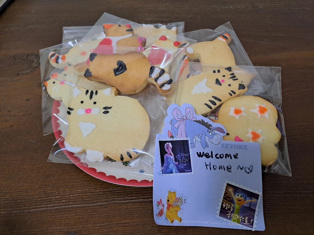 1박 2일 출장을 다녀오니 방안에 이쁜 야옹이 쿠키가 한가득이다. 웰컴 메시지도 있다. 이런 따뜻한 일을 할 사람은 딱 한 사람 사랑스러운 딸 윰이다.