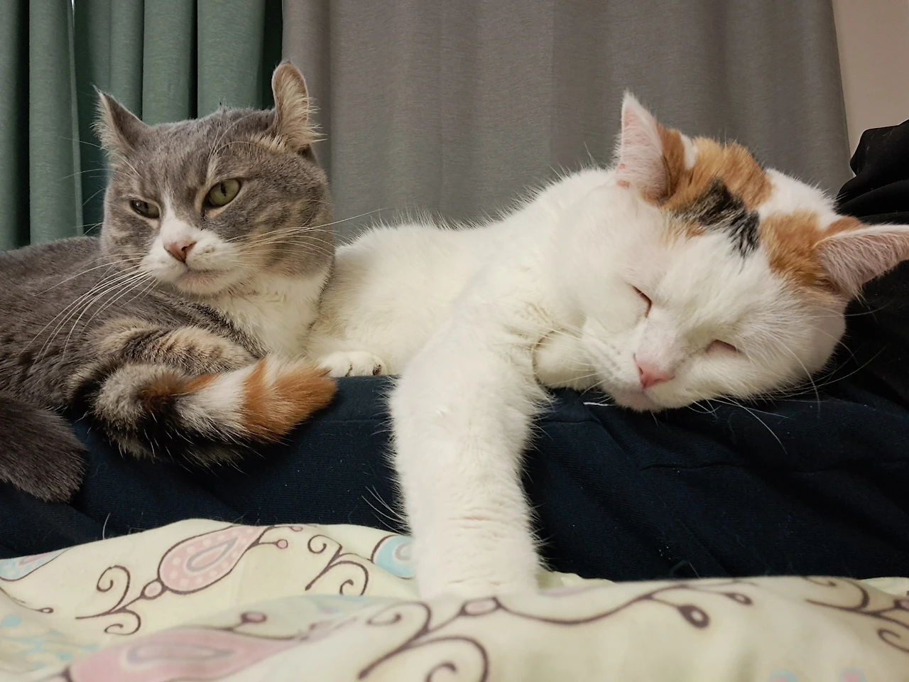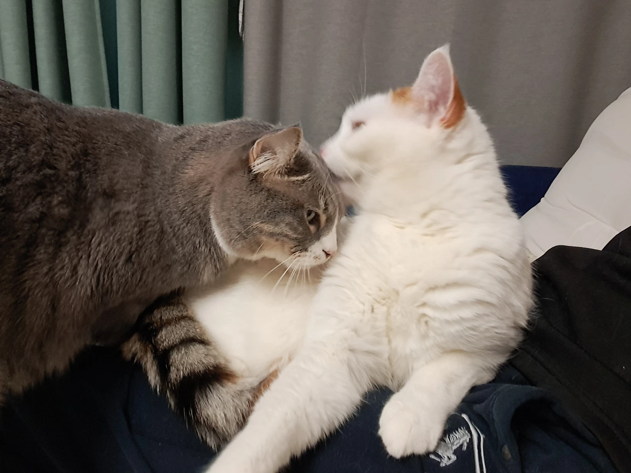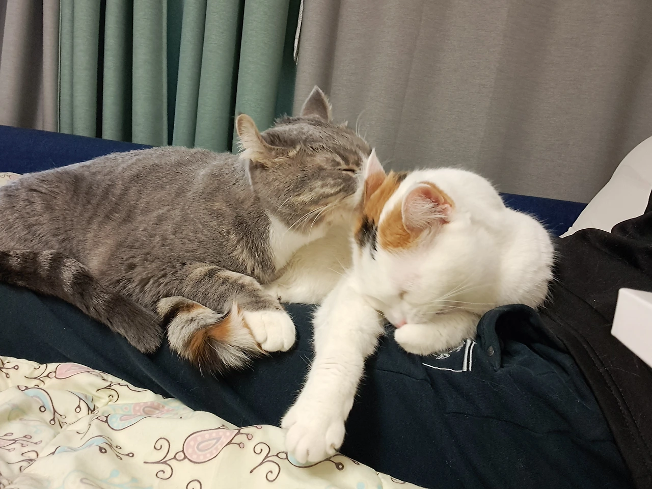 서로 그루밍을 해 주면서 행복한 크리스마스를 보내고 있다. 덕분에 나는 다리에 쥐가 날 지경이지만 가만히 앉아있는 중이다.