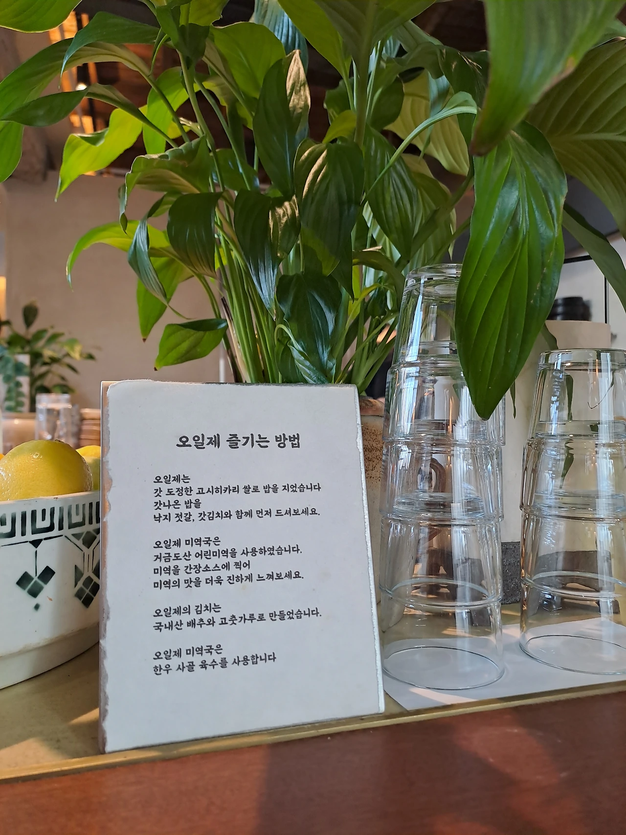 주인장의 그런 생각을 닮은 오일제는 소박하고 담백하고 깊이가 있는 맛을 선사한다. 정성스럽게 끓인 미역국 하나로 마음까지 따뜻하게 할 수 있는 주인장의 자신감과 자기만의 색깔이 아주 매력적이다. 정말 매일매일 가고 싶은 곳이다.