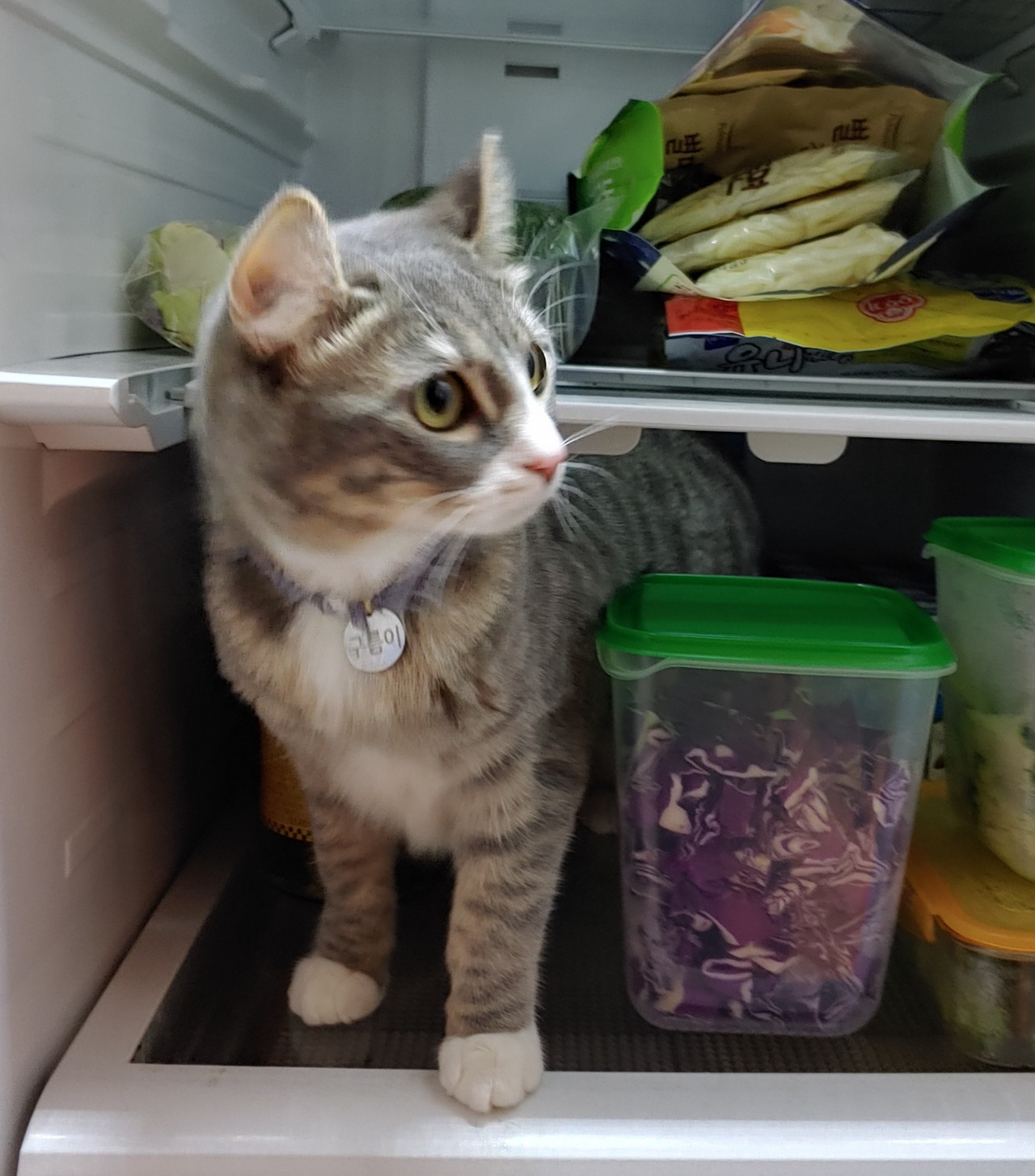 여름만 되면 냉장고 문 열기가 무섭게 냉장고 속으로 점프하는 김구름. 문 닫아버린다. 얼른 나와라~~