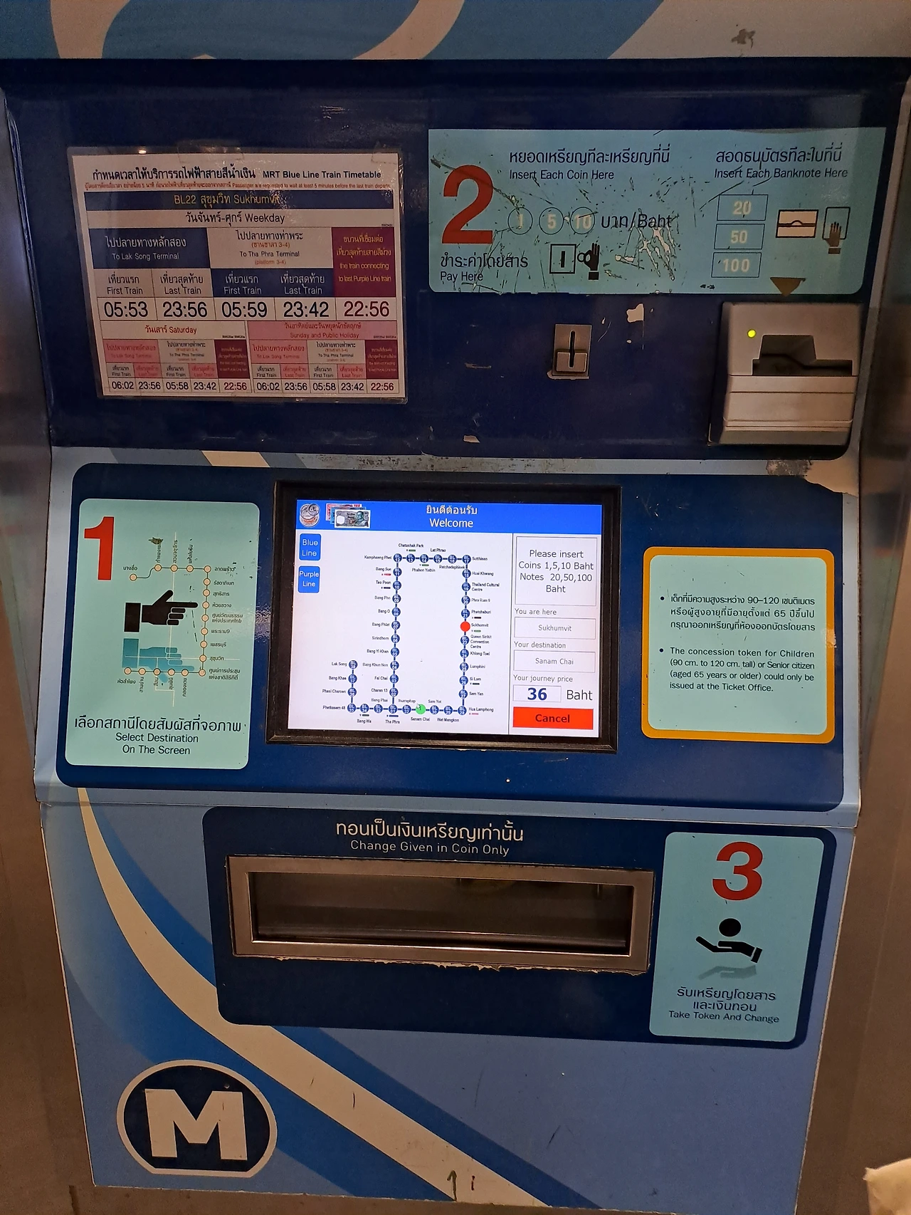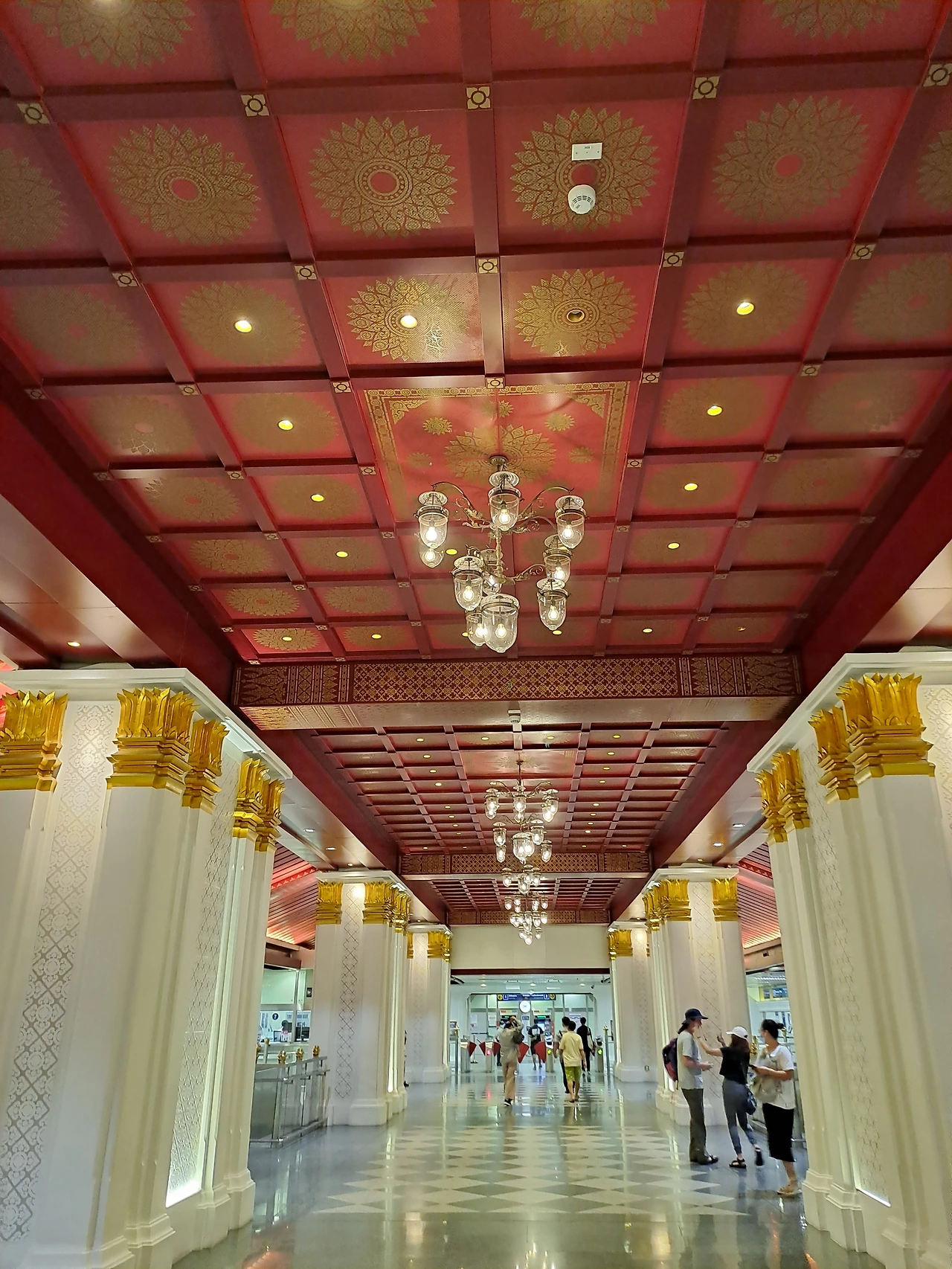 방콕 지하철은 역사가 깨끗하고 넓고 쾌적하다. 철도 내부에 승객이 많은데도 공기정화시스템이 잘 되어 있는지 신기하게도 아무런 냄새가 나지 않았다. 한여름 찌는 듯한 더위에 습도도 높고 사람들의 체취가 날 법도 한데 정말 깨끗하고 상쾌해서 기분이 좋았다. 한국의 지하철보다 훨씬 쾌적했다. 한국에서는 지하철 역사 내부에어 저절로 코를 틀어막게 되는데 전혀 그런 행동이 필요 없었다. 지상철은 타이베이라는 큐알코드가 활성화되어 있고, 지하철은 비자카드로도 결제가 된다. 한국에서도 대전지하철에서는 코인을 넣도록 되어 있는데 태국에서도 100원 동전크기의 코인을 넣는다. 왓포 사원으로 가는 지하철 내부 장식이 화려하다. 왓포 사원은 방콕에서 가장 크고 오래된 사원으로 태국에서 가장 큰 누워있는 불상을 볼 수 있는 곳이다. 이곳에 들어갈 때 격을 갖추기 위해서 민소매, 반바지, 미니스커트 등은 허용이 안되어서 미리 긴 바지를 입고 간다.(사원 앞에 코끼리 바지 파는 노점상들이 많아서 하나 사서 입어도 된다. 사원 앞이라 가격은 시장보다는 조금 더 비쌀 수 있다.)
