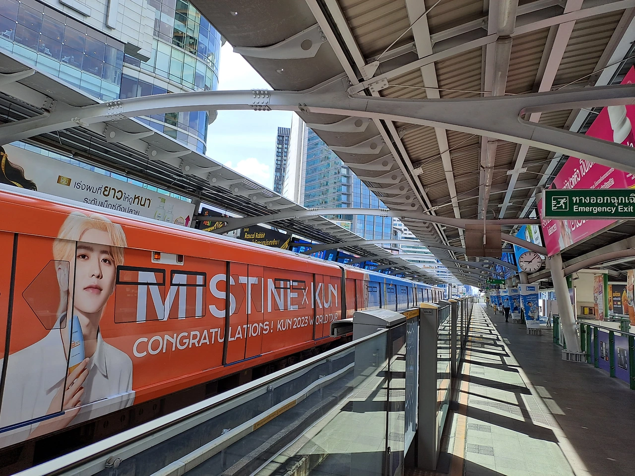 왓포 사원 지하철 내부방콕은 외부 광고를 좋아한다. 외부로 드러나는 객차, 알림판, 벽면등 눈에 잘 뜨이는 지점들은 광고포스터로 코팅되어 있고 지하철 내부에도 광고가 뒤덮여 있다. 모델들이 다들 꽃미남들이다. 그러고 보니 한국에서 유명한 아이돌 그룹 멤버 중에 태국 사람이 많았던 같다. 아이돌에 깊이 관심을 가져 본 적이 없지만 생각해 보니 그 유명한 블랙핑크 멤버 중 리사도 태국 사람이다. 화장품, 과자 광고들이 엄청나게 많다. 움직이는 광고판. 우리나라에선 버스 코팅 광고는 많이 봤는데 지상철 광고는 못 본 것 같다. 이런 광고들은 효과가 엄청 좋을 것 같다.