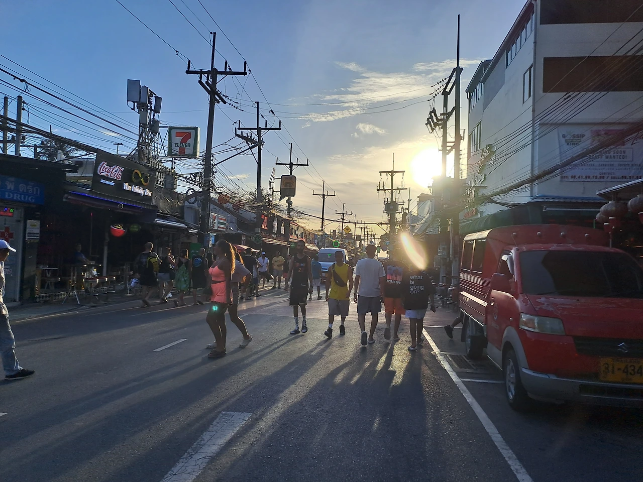 어떤 배가 볼록하게 나온 머리가 희끗한 외국 아저씨는 다섯 명의 아가씨들과 함께 신나게 술을 마시고 있었다. 밤이 깊어 갈수록 음악 소리는 더 커지고 사람들의 목소리도 더 커지고 있었다. 트랜스젠더의 천국답게 엄청 덩치가 큰 여자들이 하이힐을 신고 사진을 찍겠냐고 말을 하며 관광객의 손을 붙잡고 실랑이를 벌이고 있었다.(모르고 사진 한번 찍으면 200bt를 주어야 한다.) 그 혼잡한 길을 유모차를 끌고 구경 다니는 사람도 있고, 어린아이의 손을 잡고 대마초를 입에 물고 다니는 사람도 있었다.