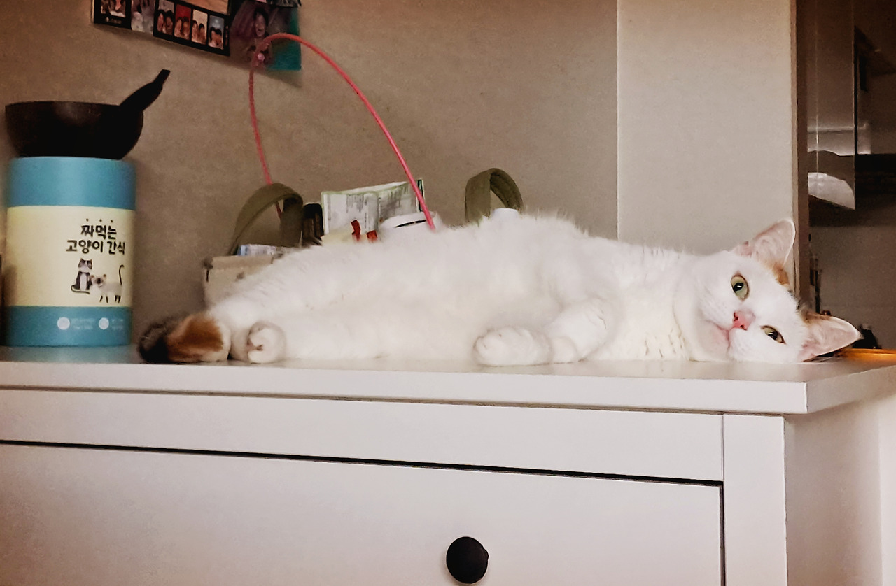 고양이는 자신의 영역을 중요히 여긴다 했다. 그리고 자기가 가장 편안하다 생각되는 곳에서만 잠을 잔다고 했다. 하루 24시간 중 16시간 이상을 잠을 잔다고 했다. 잠을 자는 듯 실눈을 뜨고 있어도 주변에 위험이 있을까 하여 수염을 움직이며 신경을 곤두세우고 있다고 한다. 그래서인지 눈을 감고 있다기도 카메라 셔터 소리가 들리면 희미하게 눈을 떴다가 익숙한 사람의 향기에 안도하고 다시 눈을 감는다.