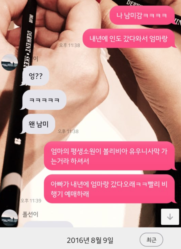 자그맣게 흩날려온 불씨를 얼른 잡아 한껏 바람을 불었다. 곧이어 내 손아귀엔 비행기 표를 끊으라는 아빠의 카드가 쥐어졌다. 그렇게 운 좋게도 나는, 엄마 소원풀이의 동행자로 발탁되게 되었다.