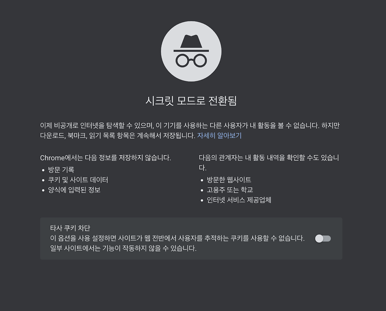 쉽게 크롬의 시크릿 탭을 생각해보면 구글에서 시크릿 탭은 다크 모드가 디폴트로 되어 있어 비밀적이고 사적인 공간임을 나타낸다.