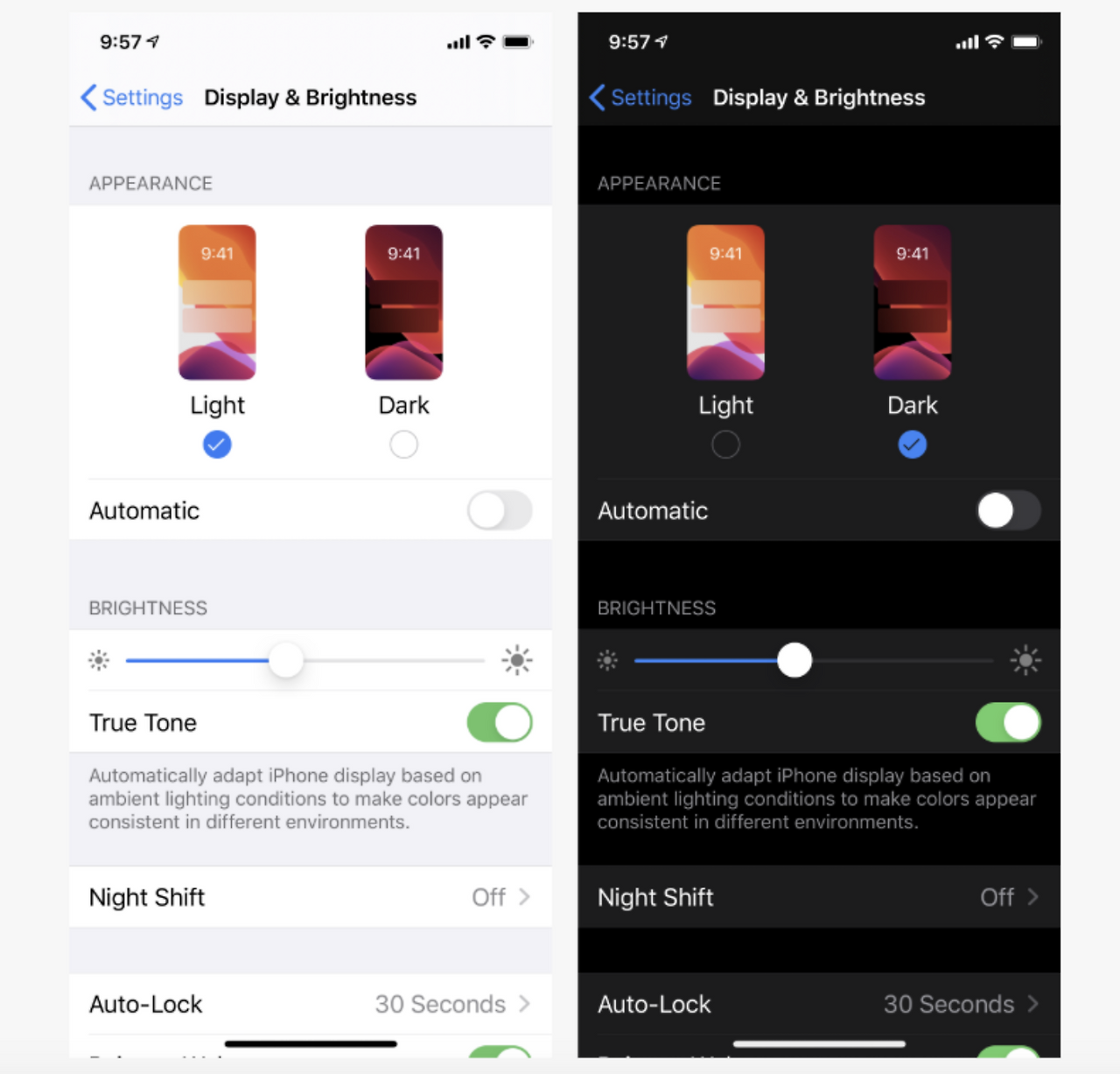 처음 애플은 다크 테마에서 글 읽기가 더 쉽다고 하였지만 대부분 연구에서 밝은 배경에서의 어두운 요소들이 더 보기 쉽다고 밝혀졌다. 흰 배경 위에 검은 글자가 가독성, 판독성, 가시성에서 모두 우수하다는 것이다.