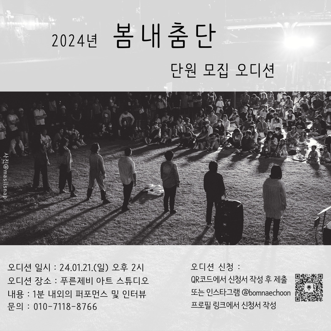 그런 관계들이 이루어지면서 자연스럽게 개인의 활동에서 같이 활동을 할 수 있는 단체로서의 활동을 바라보고 꿈꾸게 되었고 2024년을 시작하며 단체를 만들게 되었다. 이름은 이전부터 생각했었던대로 어떤 사람은 유치하다고 하기도 했지만 봄내춤단이라는 이름으로 결정하였다. 무용이라는 용어를 사용하고 싶지 않았고 지역에서 활동하는 단체라는 것을 분명히 하고 싶기도 했다. 그래도 공개 모집으로 진행하며 오디션을 운영하였고 생각보다 여러 사람의 관심과 지원을 토대로 활동을 시작할 수 있었다.