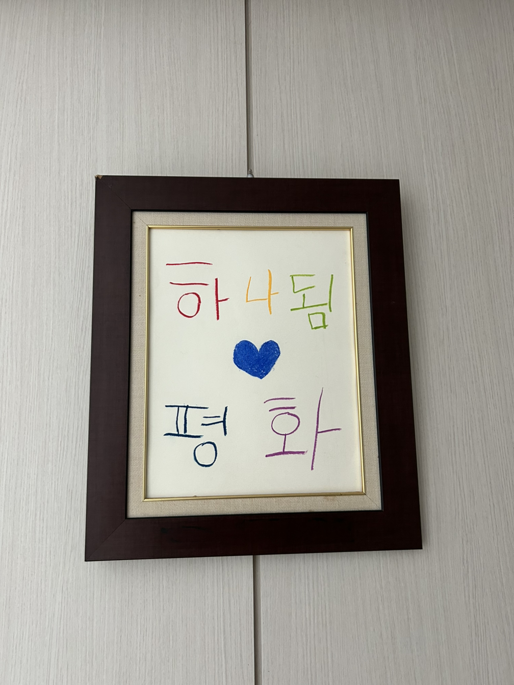 며칠 전, 사무실 한쪽 공간에 여느 사진 액자들(예컨대, 프란치스코 교황Pope과 교구 주교 등)과 함께 쌓여 있는 그림 액자가 있어 들춰보았다. 색연필로 ‘하나됨•평화’란 글씨가 쓰여 있다. 춘천 교구 사목 표어다. 필체를 보니 어린아이의 그것 같은데 묘하게 ‘작품’이라는 느낌적 느낌이 전해진다. 다른 이들에게도 그리 느껴졌기에 액자에 담아 두었겠지. 동료 자매(율리안나)에게 확인하니 위의 그 여자 아이 작품이란다. 그리 오래전 일은 아닌 듯하다.