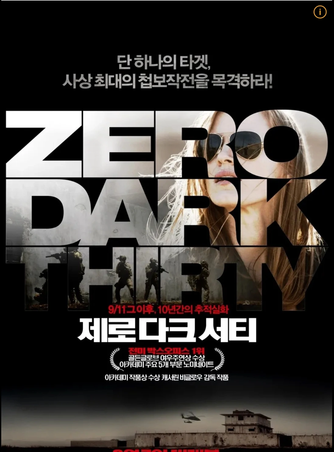 여성 감독으로서 독특하게도 전쟁영화를 여럿 만들었다. 그녀의 또 하나의 유명 전쟁 영화 중 하나가 <제로 다크 서티(Zero Dark Thirty)>(2012). 9.11의 주모자이자 전쟁범인 오사마 빈 라덴을 추적, 제거하는 과정을 실화를 배경으로 하여 만든 영화다. 뉴욕비평가협회 작품, 감독상(2012), 골든글로브 여우주연상(제시카 체스테인, 2012), 아카데미(2013) 5개 부문 노미네이트 및 음향편집상 수상 등 화려한 수상 이력이 있다. 빈 라덴 사살, 제거 당시 백악관에 모인 주요 인사들의 사진은 역사가 되었다. 넷플릭스가 자사의 다큐멘터리 시리즈 중의 하나인 <American Manhunt>에서 <오사마 빈 라덴> 편을 최근(2025년)에 릴리스했는데 이를 보면 <제로 다크 서티>가 얼마나 사실에 기반을 두고 만들었는지 확인할 수 있다. 케서린 비글로우가 <허트 로커>에 이어 또 한 번 작품, 감독상을 받을 수 있었으나 영화 중 CIA의 고문 장면을 당국(?)이 불편하게 여겨 주요 부문 시상 대상에서 제외했을 것이라는 합리적인 의심도 있다.(나무위키)