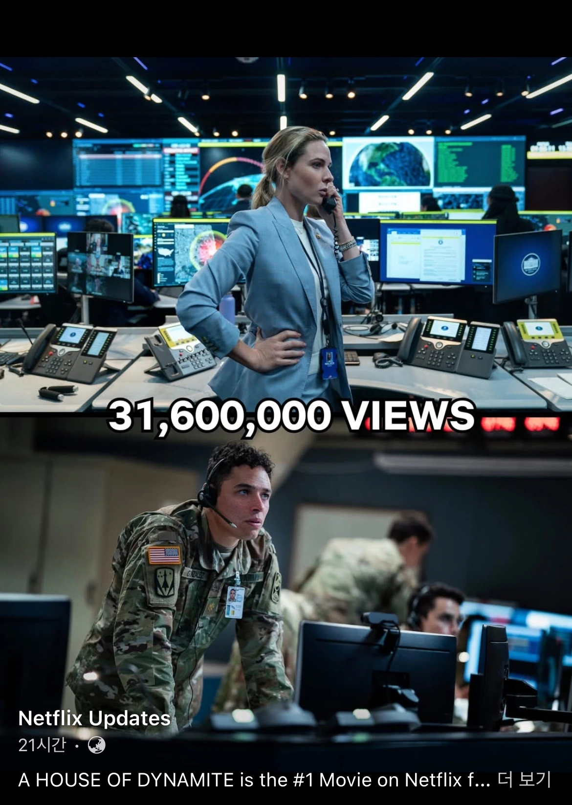 <하우스 오브 다이너마이트(A House of Dynamite)> 가 10월 말, APEC 행사 직전에 넷플릭스 플랫폼에 실렸다. 정치 스릴러 특유의 재미와 감독(캐서린 비글로우)의 명성에 얹혀 인기몰이 중이다. 엊그제 기준 32백만 여 뷰를 기록했다는 자체 광고가 소셜미디어 상에 오른다. 영화는 핵전쟁(핵폭발) 직전 약 30분 간의 극도의 긴박한 상황과 절체절명의 위기의식, 진퇴양난의 의사결정(선택) 국면들을 동일 싯점, 각기 다른 공간, 각각의 다른 인물들의 시각으로 묘사하는 독특한 문법을 취했다. 핵전쟁 전개 여부는 알려주지 않는다. 단지 '지정생존자'들이 핵벙커로 모이는 장면을 드론 공중장면으로만 남기고 그 이후의 스토리와 광경은 관객의 상상에 맡긴다. 주인공 중 하나인 레베카 퍼거슨(올리비아 워커 대위 역)을 보는 재미도 있다. <미션임파서블 7(데드레코닝 파트 1)>에서 멕쿼리 감독은 그녀를 너무 허무하게(?) 데려갔었다.