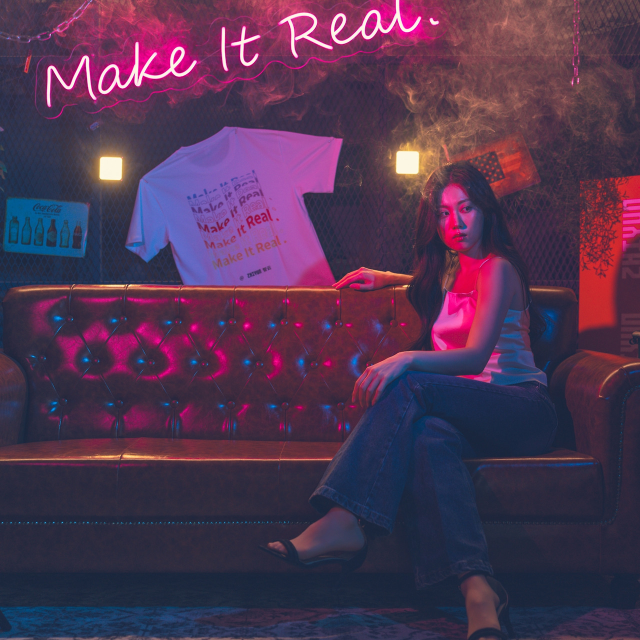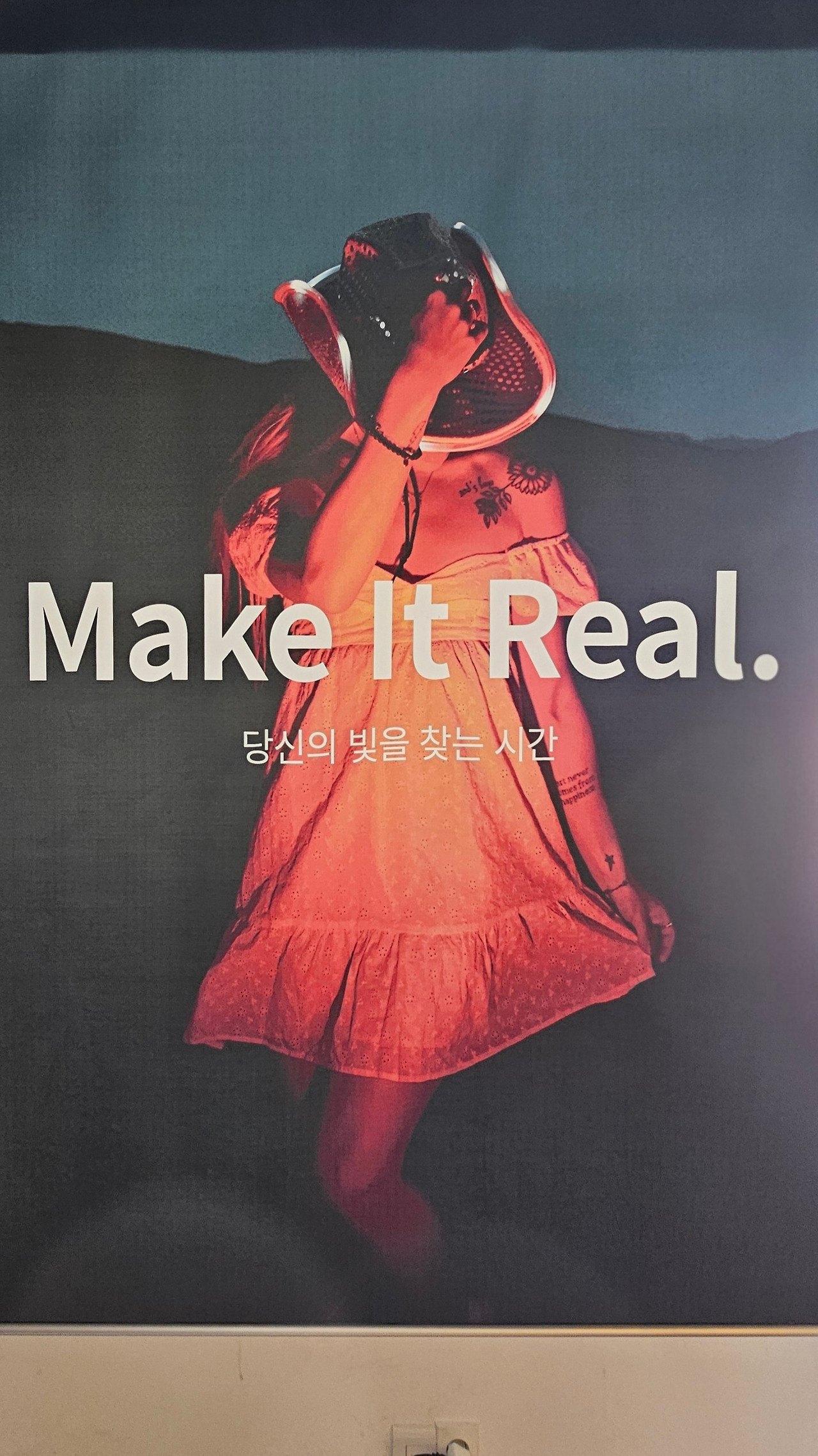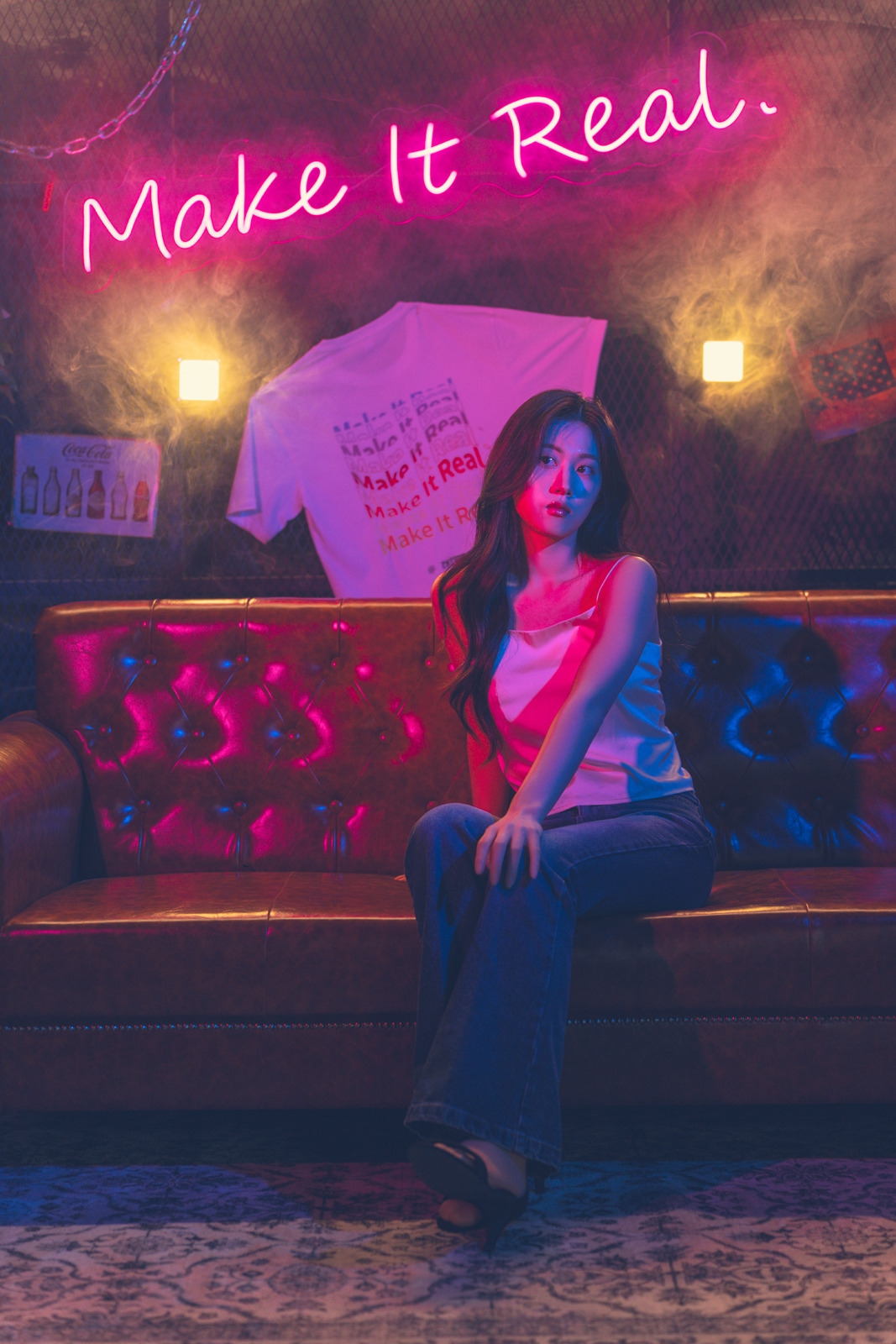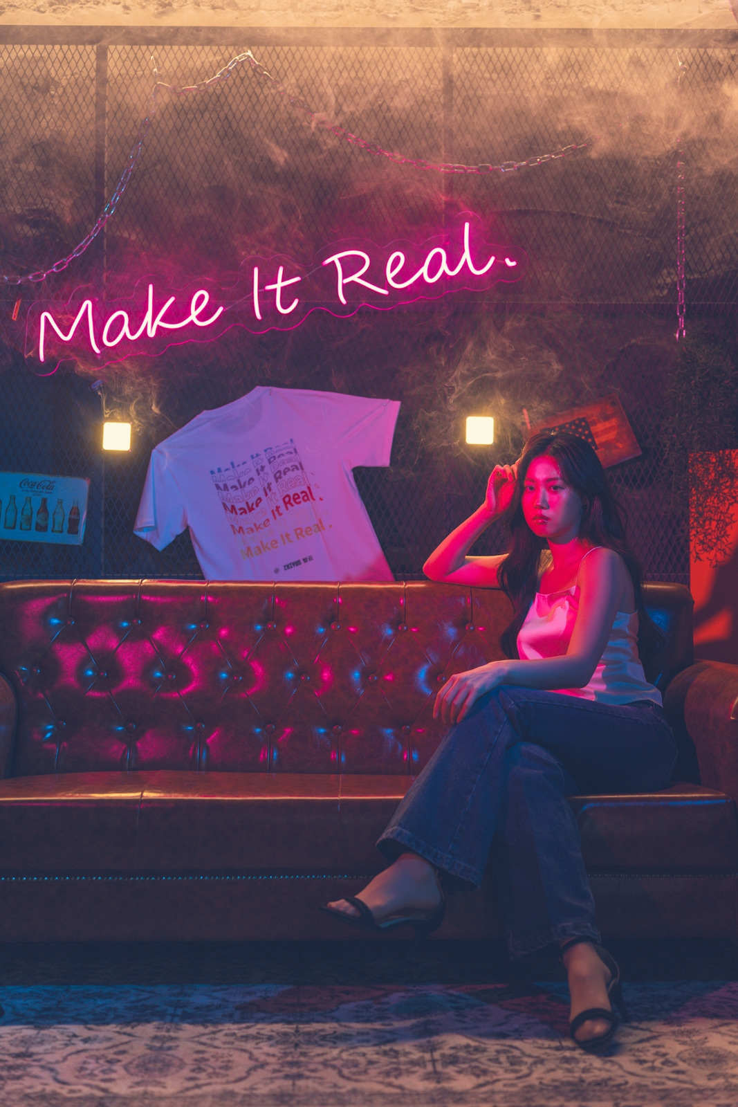 아래는 쉬는 시간을 약간 가진 후 두 번째로 진행한 촬영 컨셉이다. 같은 장소지만 조명을 달리 연출하고, 뒤에 Make It Real 텍스트에 불이 들어오면서 분위기가 완전히 달라진 것을 볼 수 있다. 이 때는 양쪽에 X100 RGB 조명을 각각 배치하여 모델분의 좌우측에 각각 색상을 입혀 촬영하도록 연출되었다.