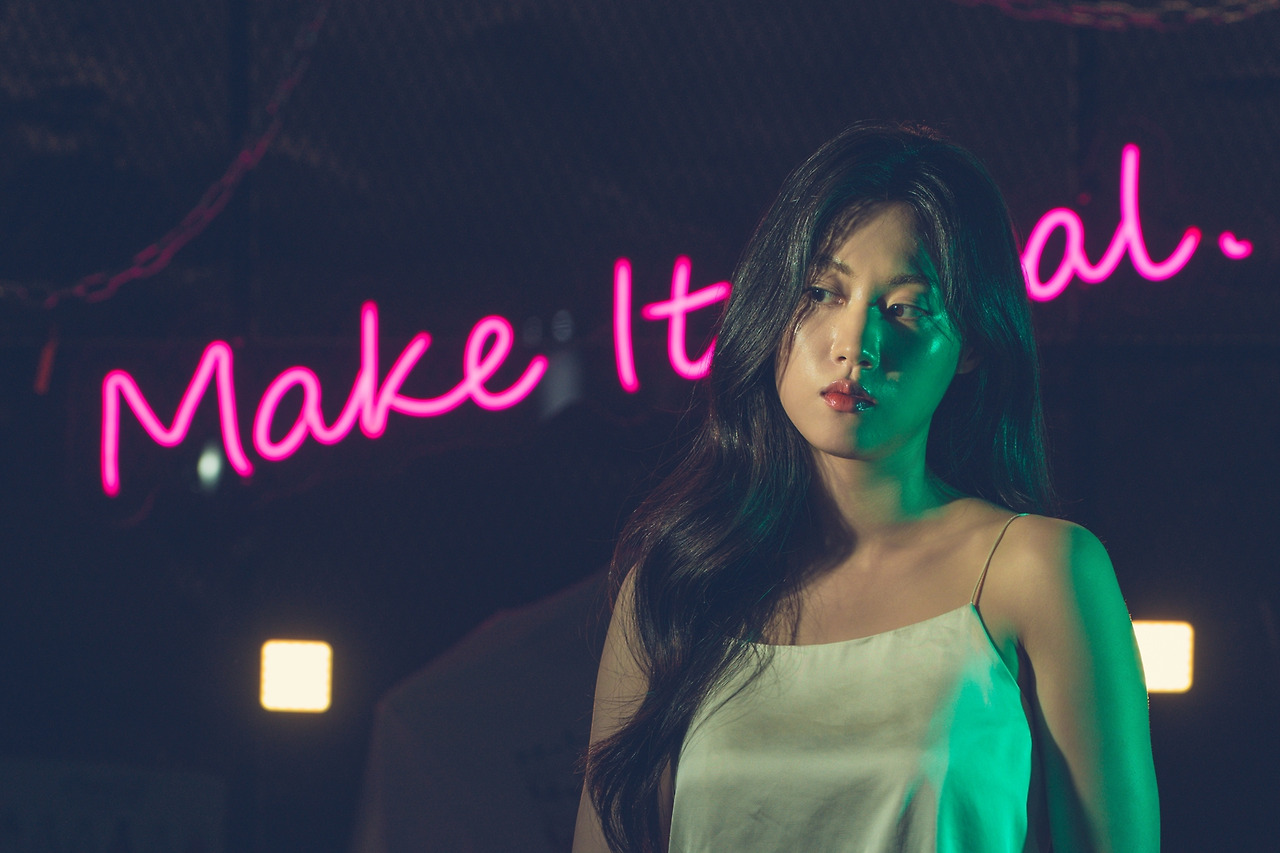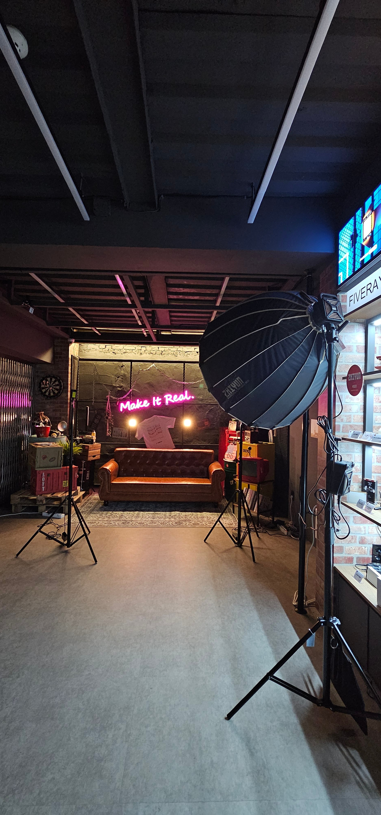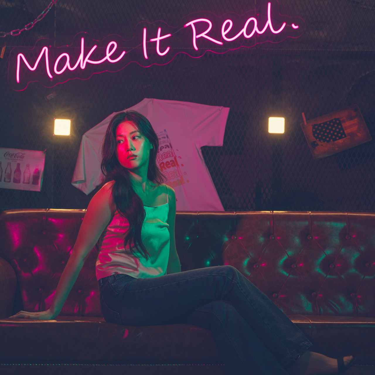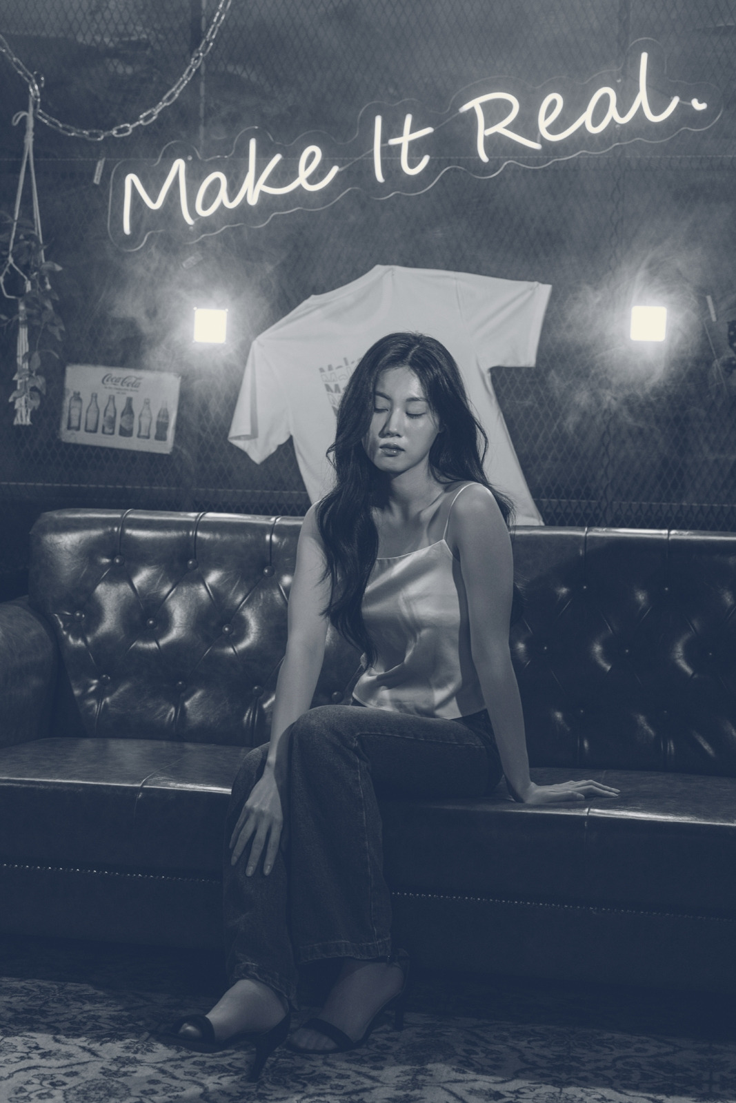 아래는 쉬는 시간을 약간 가진 후 두 번째로 진행한 촬영 컨셉이다. 같은 장소지만 조명을 달리 연출하고, 뒤에 Make It Real 텍스트에 불이 들어오면서 분위기가 완전히 달라진 것을 볼 수 있다. 이 때는 양쪽에 X100 RGB 조명을 각각 배치하여 모델분의 좌우측에 각각 색상을 입혀 촬영하도록 연출되었다.