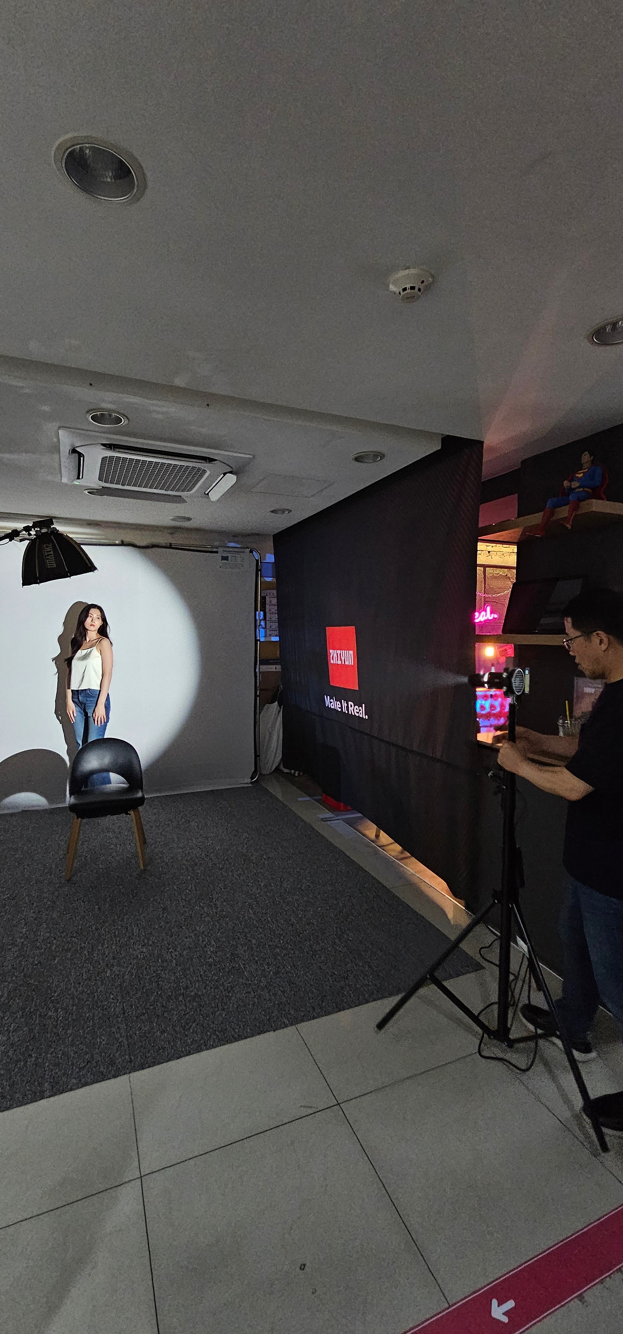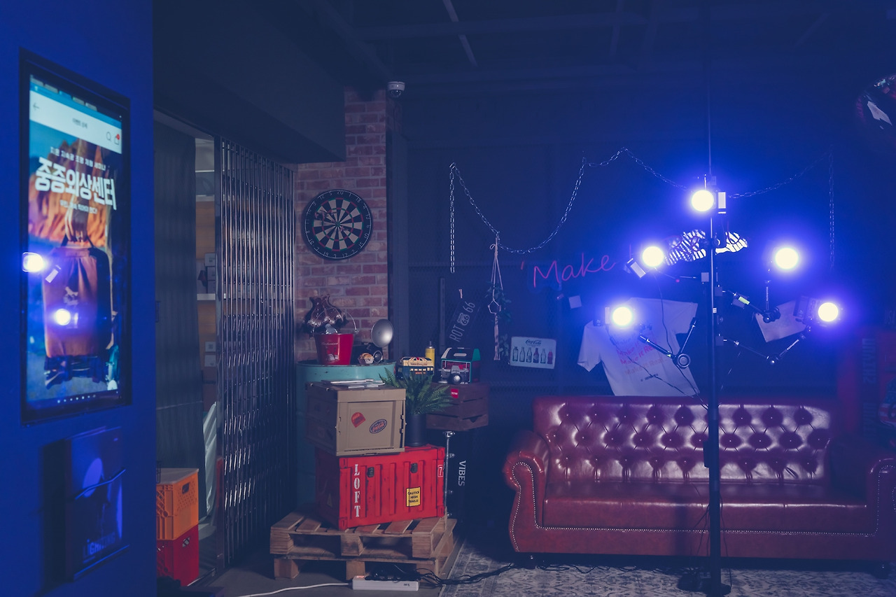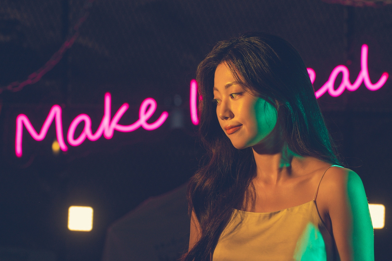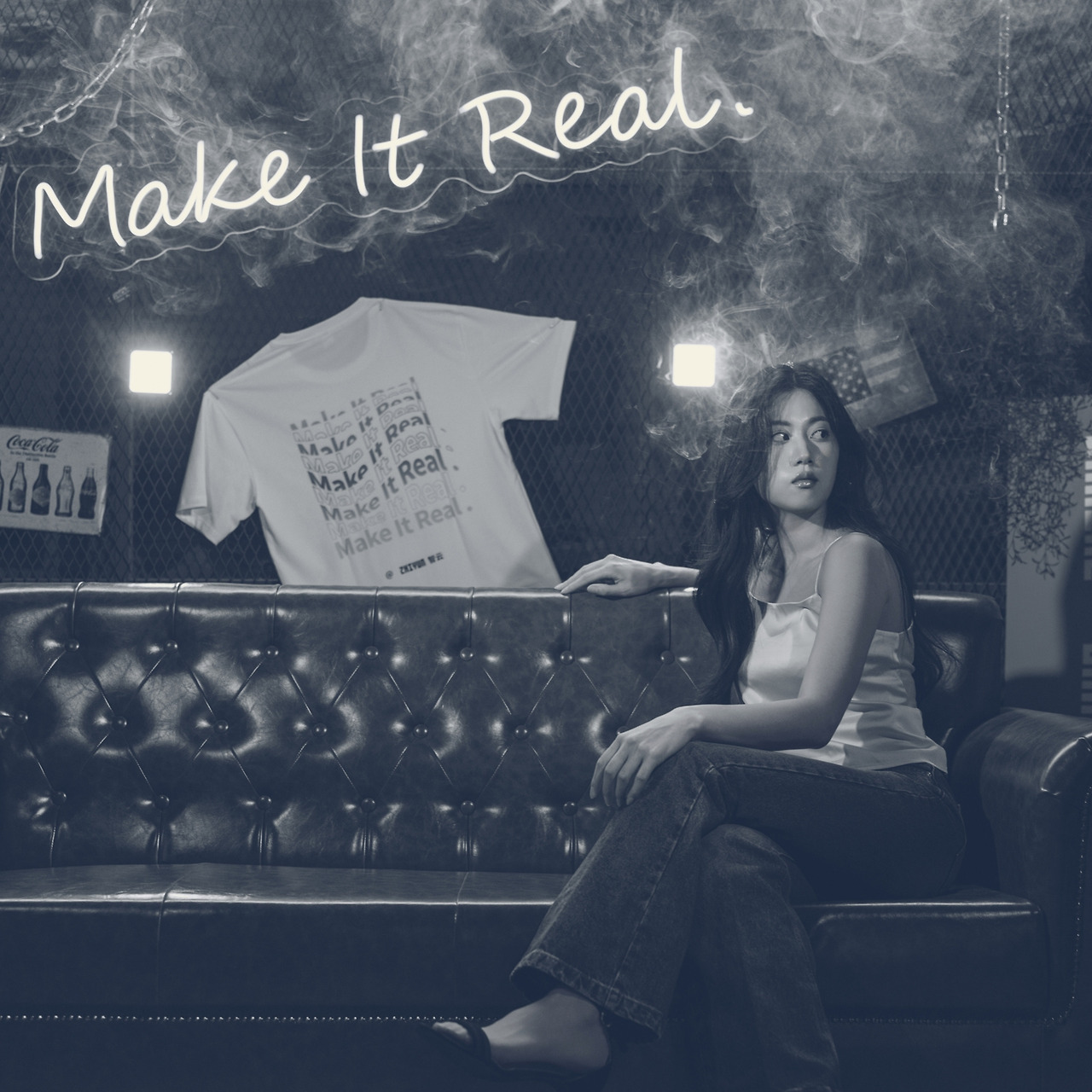 아래는 쉬는 시간을 약간 가진 후 두 번째로 진행한 촬영 컨셉이다. 같은 장소지만 조명을 달리 연출하고, 뒤에 Make It Real 텍스트에 불이 들어오면서 분위기가 완전히 달라진 것을 볼 수 있다. 이 때는 양쪽에 X100 RGB 조명을 각각 배치하여 모델분의 좌우측에 각각 색상을 입혀 촬영하도록 연출되었다.