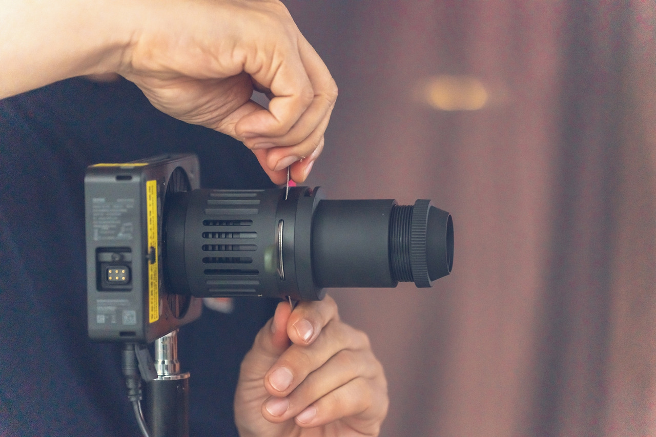 마지막 촬영은 스팟라이트 어태치먼트를 이용한 촬영이다. 다른 조명들에서는 보통 옵티컬 스누트라고 부르는 장비로 알고 있다. 이 부가장비는 빛을 좀 더 모아주고, 앞단에 필터를 이용해 빛의 모양을 다양하게 연출하는 것이 가능하다. 빛으로 만들어낸 테두리 역시 날카로운 엣지가 살도록 연출할 수도 있고, 좀 더 부드러운 경계선으로 바꾸는 것도 가능하다. 일반적으로 광원의 크기가 작아지기 때문에 인물 전체를 덮기 위해서는 거리를 좀 더 떨어뜨려야 했다.