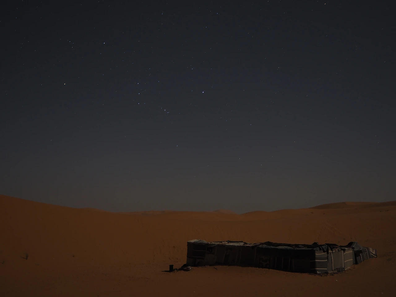 다른 사람들이 잠자리에 들 무렵 삼각대를 꺼내 카메라 배터리가 다될 때까지 덜덜 떨며 밤새 사진을 찍었다. 달이 너무 밝은 것이 아쉬웠다. 전등 하나 없는 사막 한가운데였지만 달빛만으로도 충분히 밝았다. 이 추위에도 가이드들은 밖에서 자고 있었다.