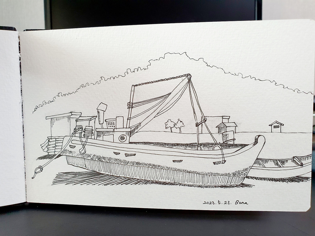 재미있는 게 수강생들의 그림을 보면 대충 그 사람이 어떤 성격인지 드러난다. 내 그림을 보고 강사는 '그림을 보면 꼼꼼하고 완벽주의적인 성격일 것 같네요. 정리정돈을 깔끔하게 잘하실 것 같아요.'라고 말했다. 배 그림을 그린 후 수강생 그림을 모두 모아서 각자 비교해 보는 시간을 가졌는데 어느 것 하나 똑같은 그림은 없었다. 선의 굵기, 디테일, 배경, 강조하는 부분 등이 모두 달랐다. 스타일이란 만들어지는 것이 아니라 재채기처럼 자연스럽게 드러나는 것이 아닐까.