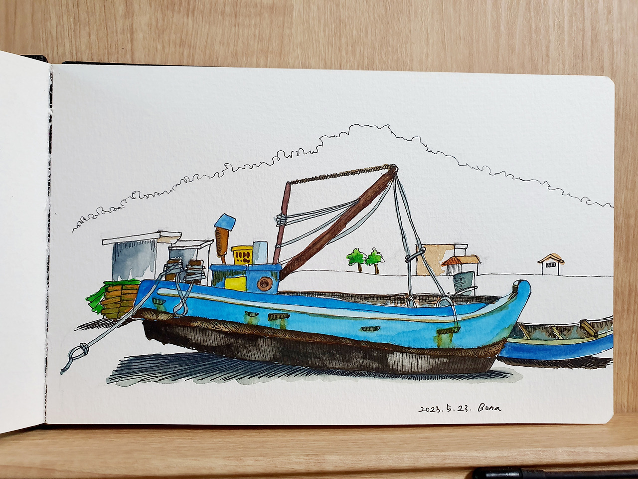 사진에서 배에 녹슨 부분을 어떻게 표현할까 궁리하다가 물기가 남아있을 때 휴지로 물감을 칠한 부분을 살짝씩 눌러서 녹이 슬어 칠이 벗겨진 것처럼 표현하였다. 이것을 보고 강사가 '이렇게 표현할 수도 있군요!'라고 말한 것을 듣고 내심 뿌듯하기도 하였다. 칭찬받지 않기로 했지만 오는 칭찬을 막지는 않는다.