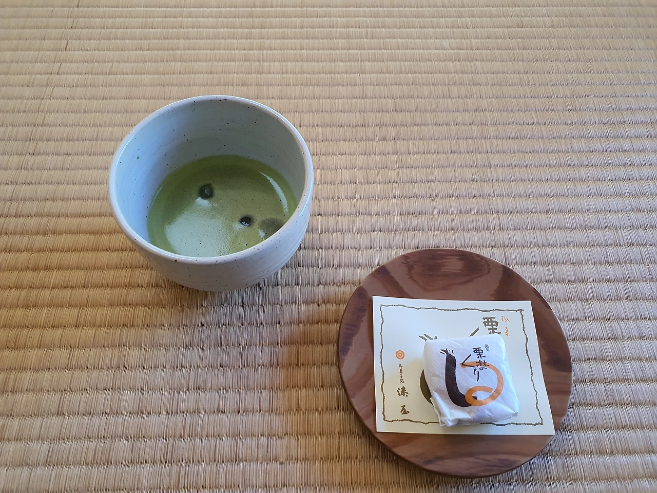 넓은 다다미에 앉으면 말차와 만주 세트를 준다.