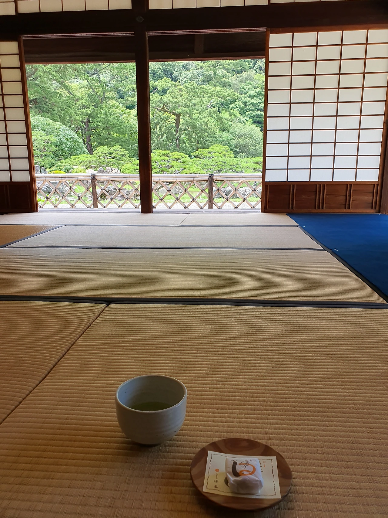 그 당시 제일 듣고 싶은 말을 점원이 해 줬다. 선풍기 옆에 바짝 붙어 가능한 말차를 천천히 마시면서 땀을 식혔다. 다다미에 위에 앉으면 사방이 뚫려있어 그림 같은 정원의 풍경을 감상할 수 있다. 문과 기둥이 하나의 프레임으로 작용해 그 너머에 있는 자연이 그림처럼 보인다. 에도 시대 일본 귀족은매일 이런 풍경을 봤겠지. 절로 마음이 정화됐겠지.