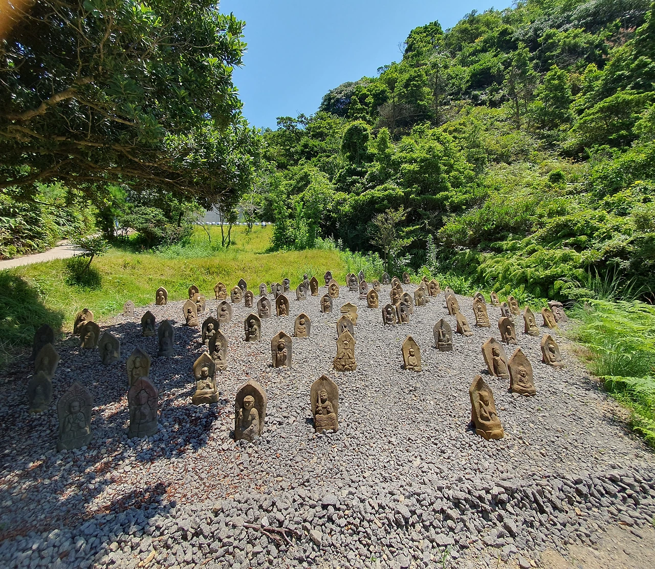 나르시스 정원 바로 뒤에는 수십 개의 불상이 모여있었다. 스페인의 산티아고처럼 일본 시코쿠에도 순례길이 있는데 '오헨로'라고 한다. 오헨로의 88개의 사찰을 돌면서 그 옛날 시코쿠의 고승처럼 지팡이를 들고 사찰을 돌아다니는 여행객이 많다고 한다. 작가는 88개의 사찰처럼 나오시마에도 에도시대에 만들어진 불상이 88개가 있음을 조사하고 인근 데시마 섬에서 나온 불법 산업 폐기물을 소각해서 남은 찌꺼기로 불상을 만들었다. 인간이 버린 쓰레기로 인간이 경외하는 불상을 제작한 점이 오묘했다.