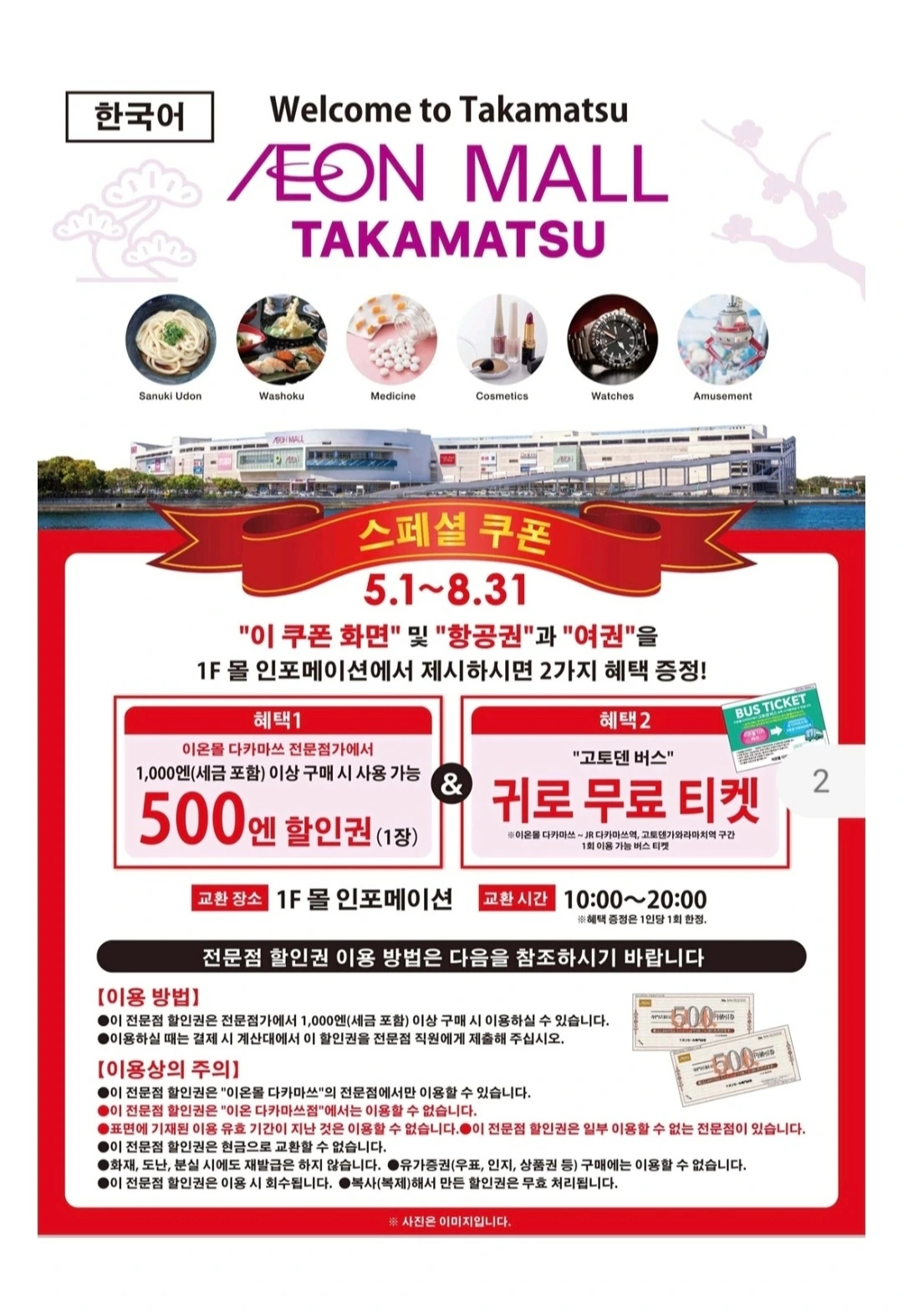 이온몰을 가려는 이유는 바로 아래 쿠폰 때문이었다. 호텔에서 이온몰까지 100엔만 내면 셔틀버스를 탈 수 있고 올 때는 버스비가 무료였다. 더군다나 이온몰에서 1,000엔 이상 구매 시 500엔이 할인된다기에 더더구나 안 갈 이유가 없었다. 같이 버스를 타는 승객 중 한국 아주머니 3분이 장바구니를 들고 나란히 앉아 계셨다. 내적 쇼핑 메이트로 생각하고 30분 동안 시내 구경하며 이온몰에도착했다.