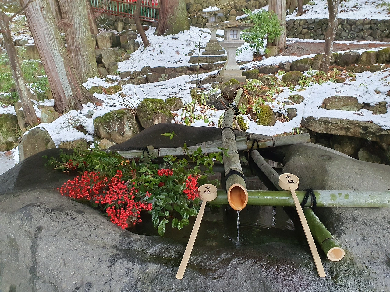 대나무 관을 통해 물이 졸졸 흐른다. 빨간색 열매가 달려있는 나뭇가지를 놓아둬 눈길을 끌었다.조경에 진심인 일본.