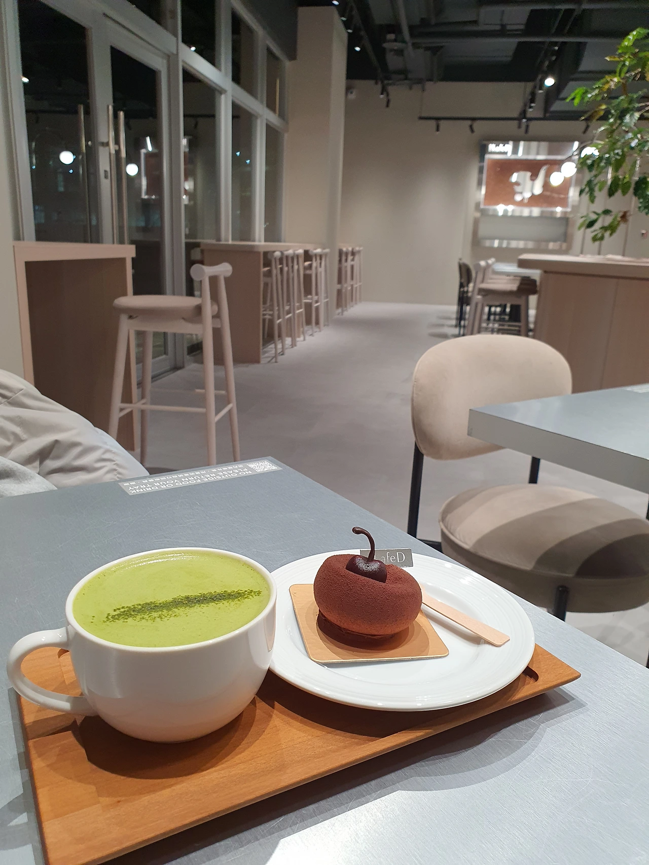 이대로 가기 아쉬워 디저트도 먹었습니다. 원래 커피 맛집이라는데 저녁에 카페인 섭취가 걱정돼 말차라테로 선택! 저 사발 같은 컵 보이 싶니까. 의외로 체리 초코케익이 너무 맛있어서 감탄하며 먹음.(저기 체리모양도 초콜릿이에요)
